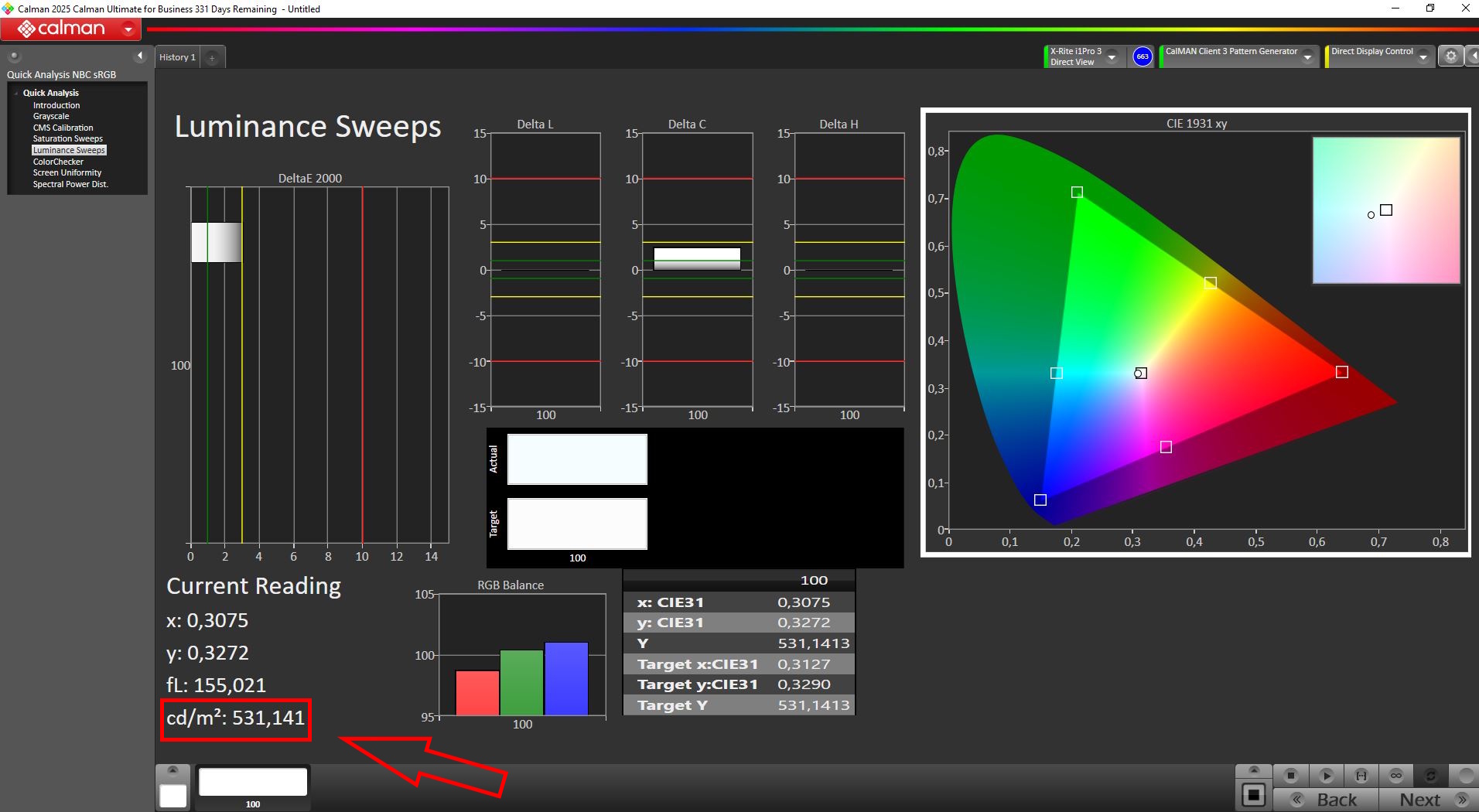 A 100%-os fényerőnél a panel nagyjából 530 nitet ér el.