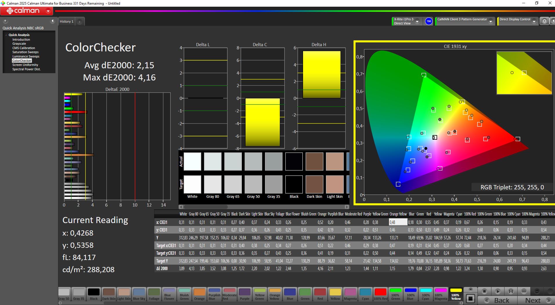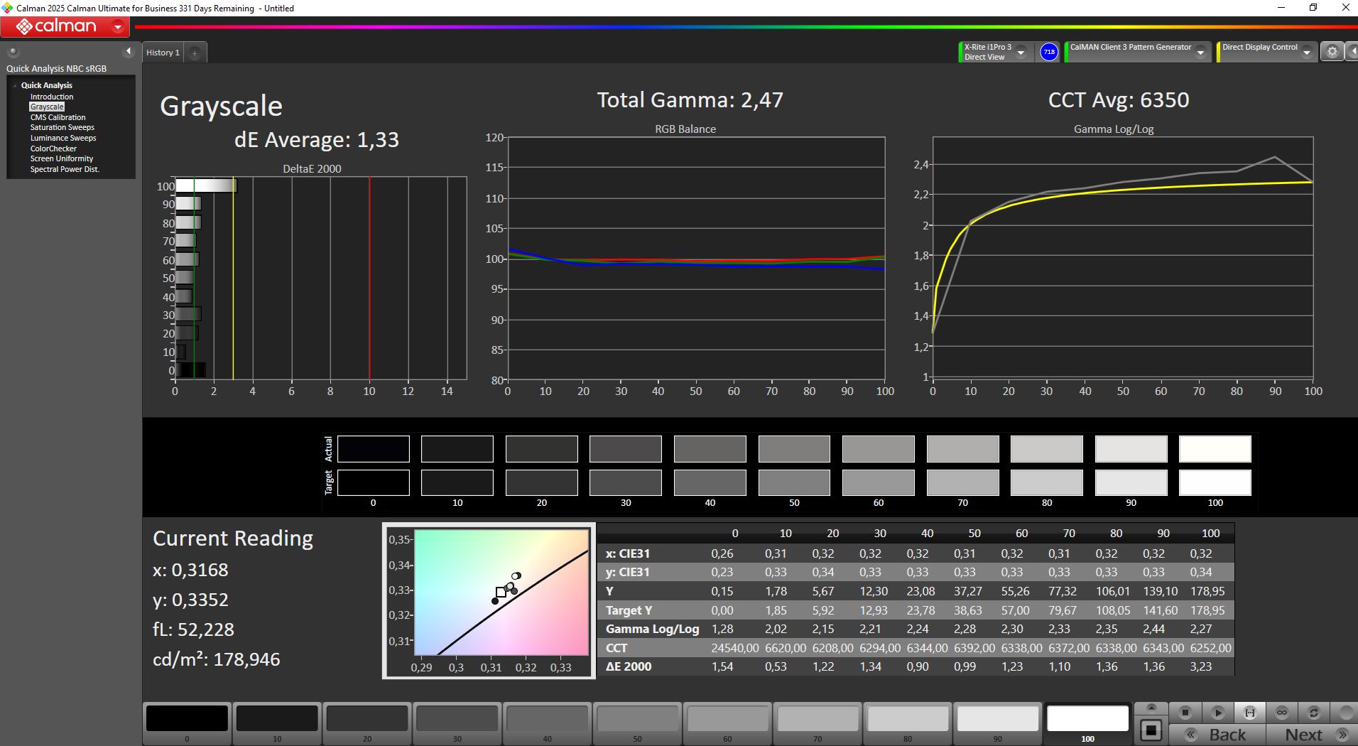 A dobozból kivéve a kijelző meglehetősen jól kalibrált. A kézi kalibrálás után a szürkeárnyalat- és színeltérések tovább csökkentek, és az átlagos deltaE értéke 1,3 körül alakult.