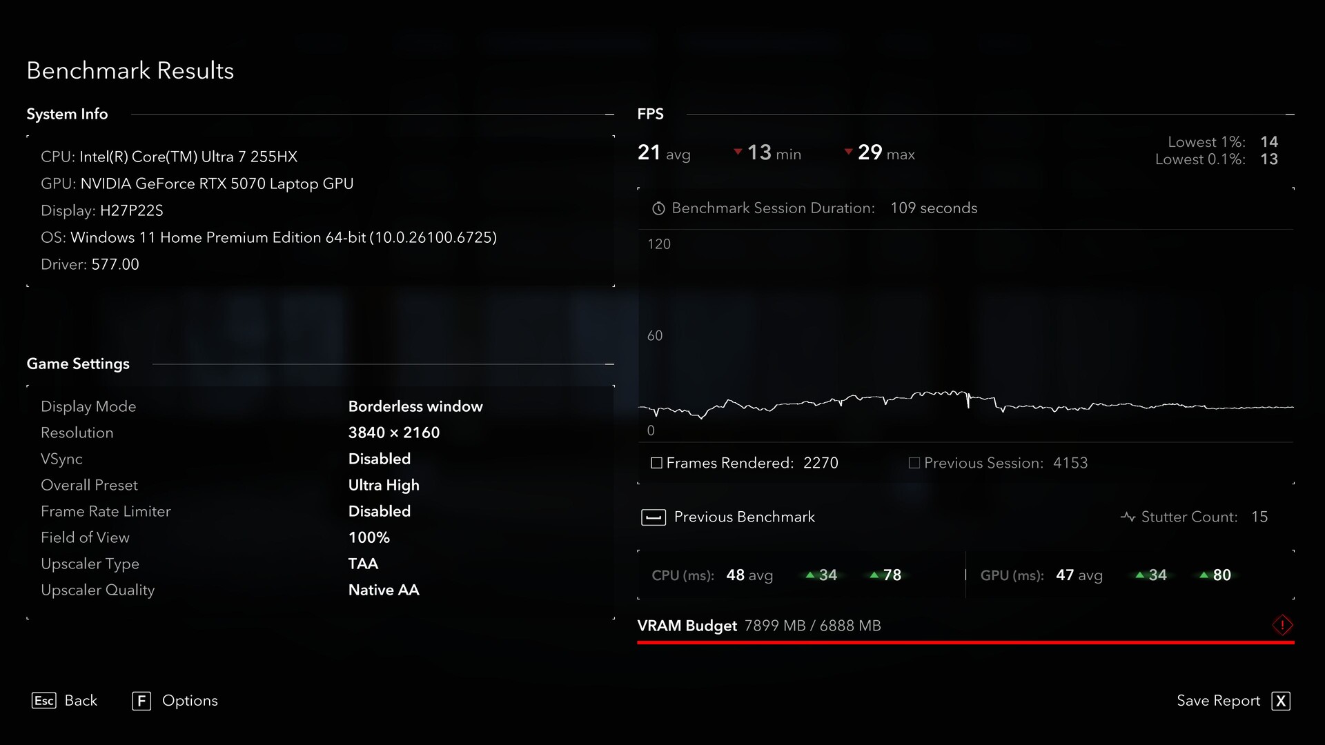 Hogy tovább terheljük a VRAM-ot, natív 4K-ra váltottunk. Most már - legalábbis a mutató szerint - a VRAM-igény jócskán meghaladja a limitet - és 15-ös stutterszámot regisztráltunk. A probléma itt: natív 4K-nál már 21 fps-es átlagnál tartunk, így nehéz megmondani, hogy a dadogás valóban a VRAM-korlátoknak köszönhető-e, vagy egyszerűen csak a GPU küzd összességében.