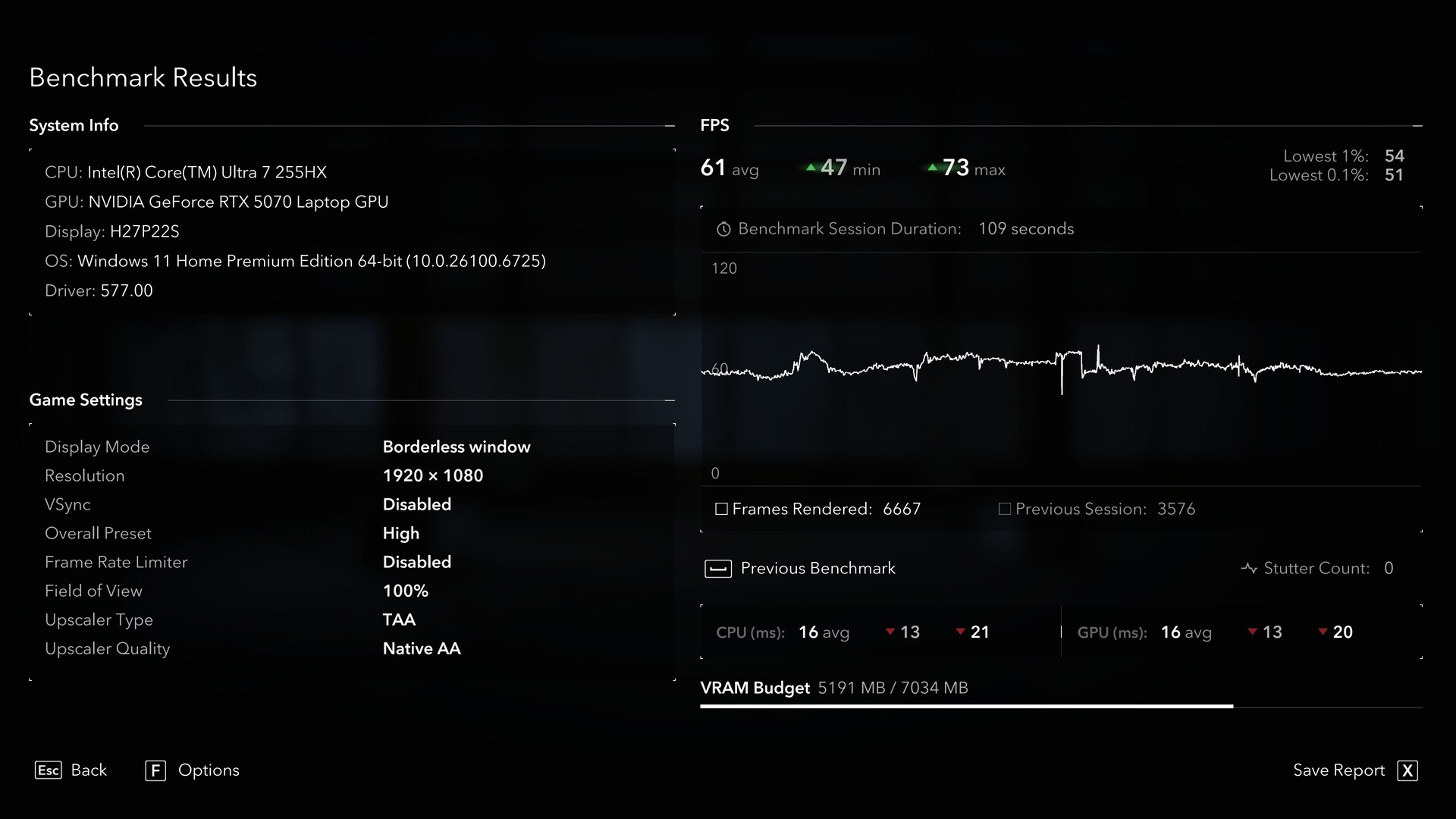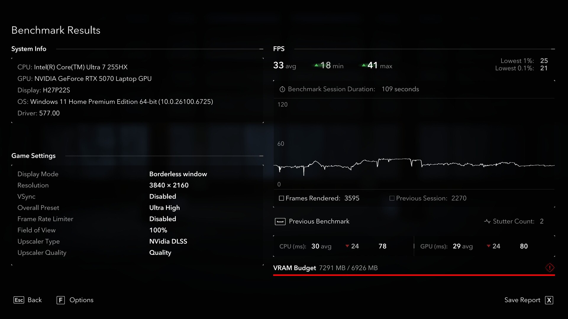 Az Assassin's Creed Shadows játékban 2 560 x 1 440 (QHD) felbontáson a játék jelentése szerint a VRAM-keret körülbelül 100 MB-tal túllépte a keretet. A következő benchmarkban azonban a képkockázási idők stabilak maradnak - még ha az átlagos képkockasebesség 38 fps körül mozog is. A belső dadogásszám mindössze 1-nél regisztrál.