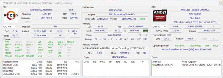 | MSI Claw A8 BZ2EM AMD Ryzen Z2 Extreme ⎘ AMD Radeon 890M ⎘ 24 GB Memória, 1024 GB SSD | List Price: 999€ | 765 g | 24 mm | 8.00" 1920x1200 283 PPI IPS | |