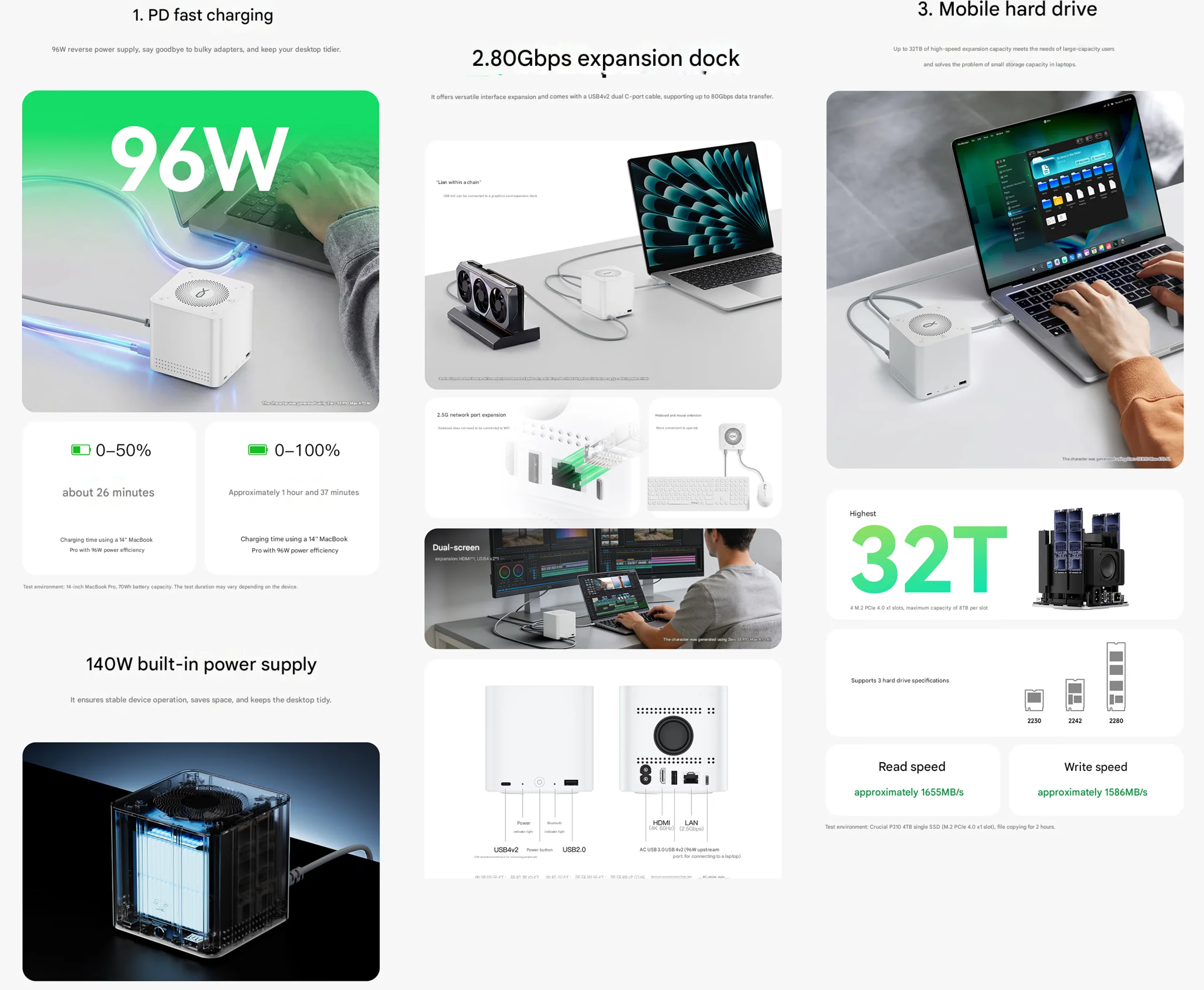 A dokkoló másik fontos fénypontja a négy M.2 bővítőhely, amelyek összesen 32 TB tárhelyet képesek befogadni. A Beelink megjegyzi, hogy ezek PCIe 4.0 x1 foglalatok, és azt állítja, hogy a dokkoló 1655 MB/s olvasási sebességet kínál, az írási sebesség pedig eléri az 1586 MB/s-ot.