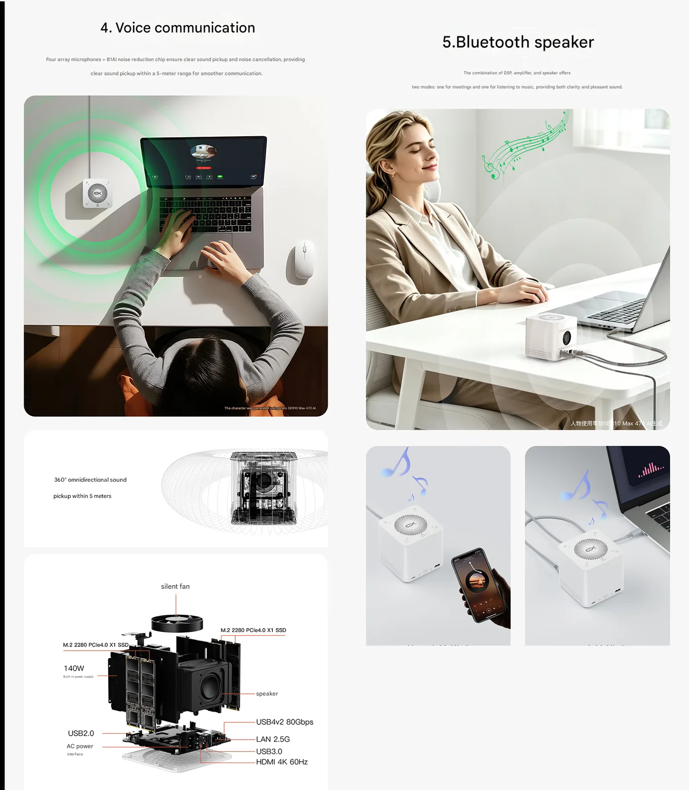 A dokkoló Bluetooth-kapcsolattal is rendelkezik, ami a beépített hangszóróhoz tartozik. A Beelink szerint beépített DSP-vel és erősítő a jó hangminőség biztosítása érdekében az értekezletek és a zenelejátszás során. A hangot vezetékes üzemmódban is le lehet játszani, de ebben az esetben a csatlakoztatott PC-n keresztül. Még ventilátor is van benne, hogy hűvösen tartsa a belső részeket.