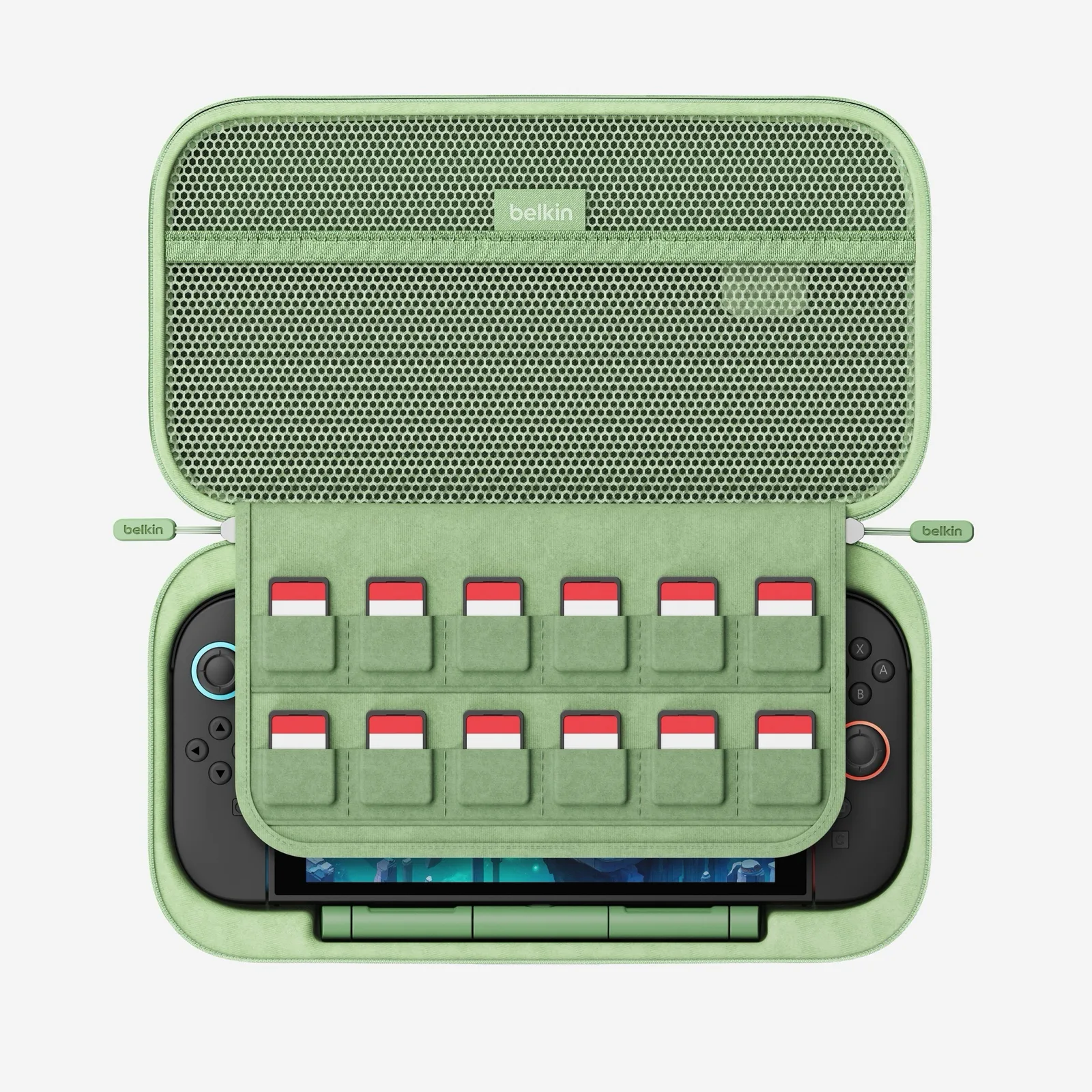 A Belkin Charging Case Pro továbbá összesen tizenkét játékkazettának kínál helyet, valamint a fedél belső oldalán található egy rekesz, amely többek között a kábelek vagy egy mikroszálas tisztítókendő számára használható. A kemény héj optimális védelmet nyújt a Nintendo Switch 2 számára, a hordozófogantyú pedig megkönnyíti a szállítást. A Belkin Charging Case Pro töltése az előlapon található USB-C porton keresztül történik.