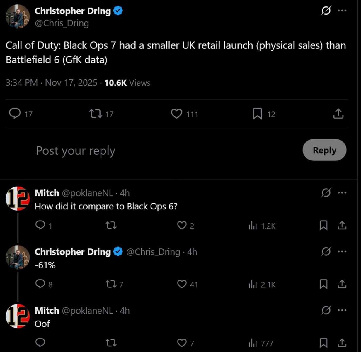 Christopher Dring a The Game Business-től a közösségi médiában cikizte a korai statisztikákat. Pontos számokat nem közölt, de Dring elárulta, hogy a legújabb Call of Duty játék felzárkózik az EA riválisához. A Black Ops 7 eladásai is jelentősen elmaradnak a sorozat korábbi darabjaitól.