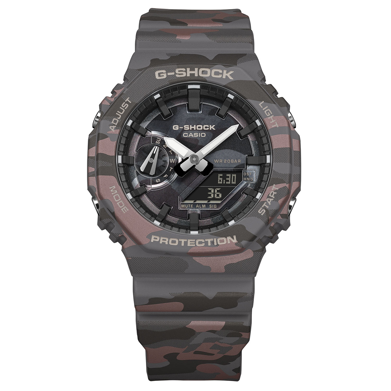 A Casio GA-2100 sorozat, amelyet a nyolcszögletű lünetta és a hibrid analóg-digitális kijelző jellemez, most hivatalosan három új színváltozatot kap: homok (GA-2100CM-5), szürke (GA-2100CM-8) és egy harmadik változat, amely vöröses árnyalatokat használ (GA-2100CMD). A gyantából készült alkatrészeken fémes nyomtatás is található. Ez a gyártási eljárás többrétegű álcázó hatást eredményez, amely magában foglalja a márka azonosítóját - a G-jelet - közvetlenül a mintába integrálva. Míg a GA-2100 korábbi változatai öntött színes gyantát vagy szabványos tamponnyomással készültek, a fémes részletek alkalmazása ezeken a modelleken a szabványos változatokhoz képest nagyobb vizuális mélységet kíván biztosítani.