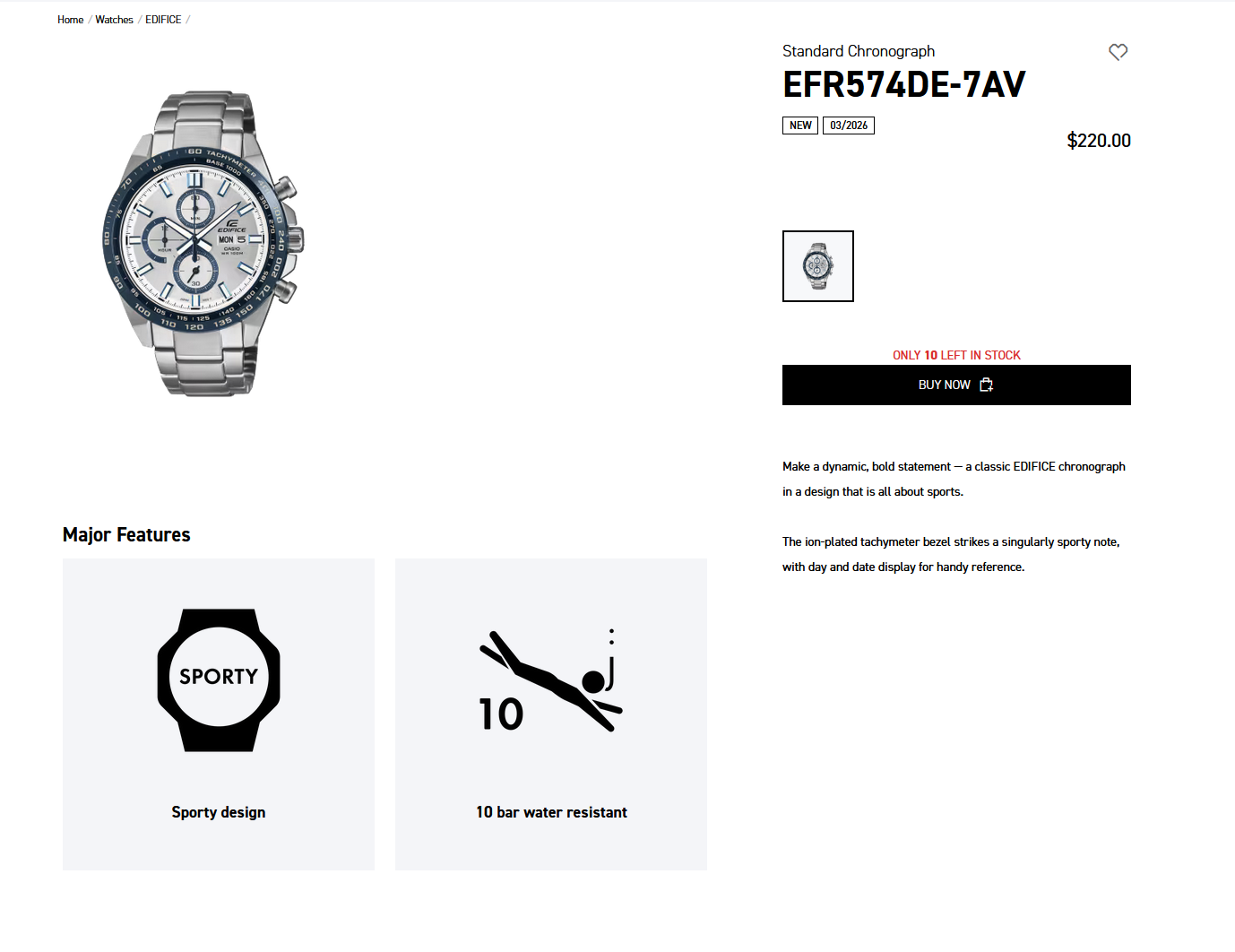 Casio egy új Edifice kronográfot tett elérhetővé az Egyesült Államokban - a EFR574DE-7AV. A korábban megjelent óra most a cég hivatalos áruházában 220 dollárért szerepel. A modell a legújabb a márka standard Edifice kronográf kínálatában, és sportos dizájnnal rendelkezik, tachiméteres lünettával és több számlapos elrendezéssel.