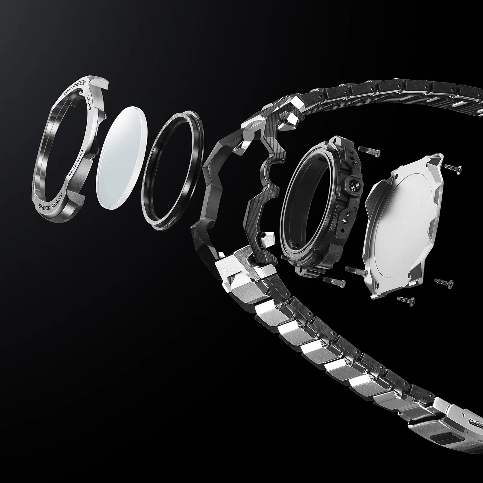 Az MTG-B4000D legnagyobb értékesítési pontja a réteges felépítése lesz, amely szénszál-erősítésű gyantát használ rozsdamentes acéllal. A Casio ezt a kétmagvú védő megközelítésének továbbfejlesztéseként írja le, ahol a karbonváz az ütések elnyelésére szolgál, míg a fém külső az általános merevséget és védelmet szolgálja. A Casio által megosztott felrobbantott ábrák világosan mutatják, hogy a keret, a lünetta és a tok hátlap különálló szerkezeti elemként működik, nem pedig egyetlen monoblokk héjként.