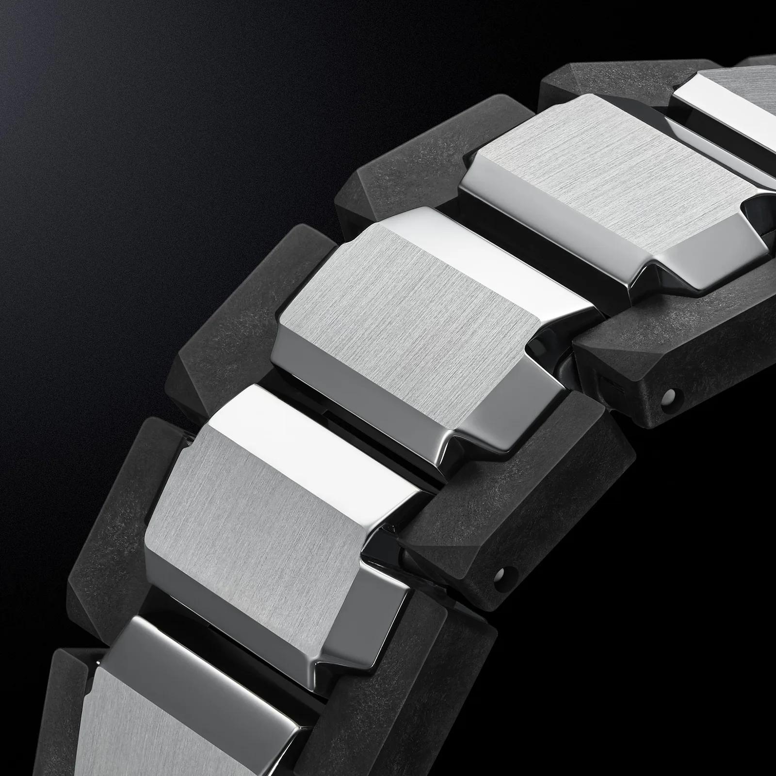 A karkötő érdekes módon hasonló "hibrid" megközelítést követ. Bár első pillantásra teljesen fémesnek tűnik, a Casio megemlíti, hogy réteges kompozit szerkezetet használ, rozsdamentes acélból és megerősített műgyanta komponensekből áll, hogy kezelje a súlyt és a hatást. A fém karperec ellenére azonban az óra 178 grammot nyom, ami kissé nehéz.