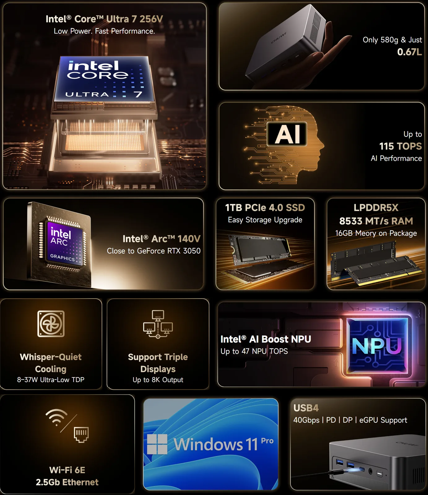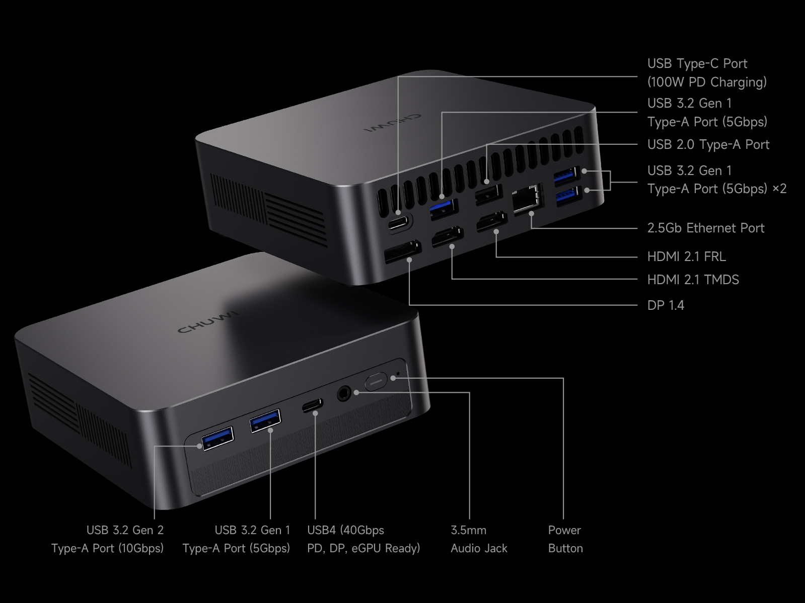 A vezeték nélküli kapcsolatokhoz WiFi 6E és Bluetooth 5.4 áll rendelkezésre. A Chuwi azt is kiemeli, hogy a mini PC 0,67 literes házzal rendelkezik, és ez a kis formafaktor ideális a kompakt munkaterületekhez. A rendszer 16 GB LPDDR5X RAM-mal és 1 TB PCIe 4.0 tárolóval van felszerelve, de két M.2-es bővítőhely is van, az egyik PCIe 5.0 SSD támogatással rendelkezik.