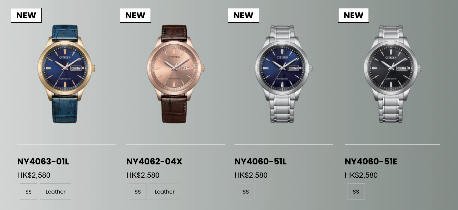 A különbségek főként a kivitelezésben és a szíjválasztékban vannak. Az NY4060-51L és az NY4060-51E egyaránt rozsdamentes acél szíjjal készül, az előbbi kék, az utóbbi fekete számlaphoz párosul. Ezek a karkötős változatok súlya 132 g. Az NY4063-01L és az NY4062-04X bőrszíjra vált, ami 70 g-ra csökkenti a súlyt. Az NY4063-01L kék számlapot használ rózsaaranyozott tokfelületekkel és kék bőrszíjjal, míg az NY4062-04X rózsaaranyozott tokkal, barna bőrszíjjal és a számlap tónusához illeszkedő számlapszíjjal rendelkezik.