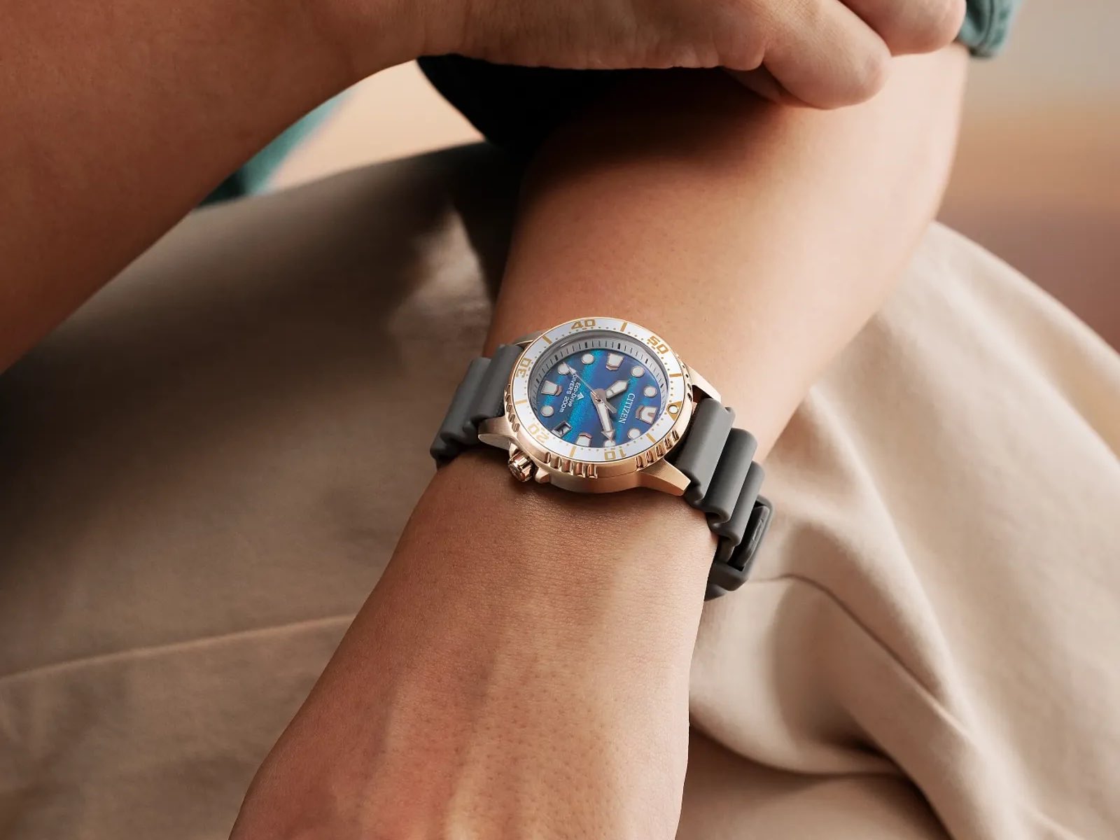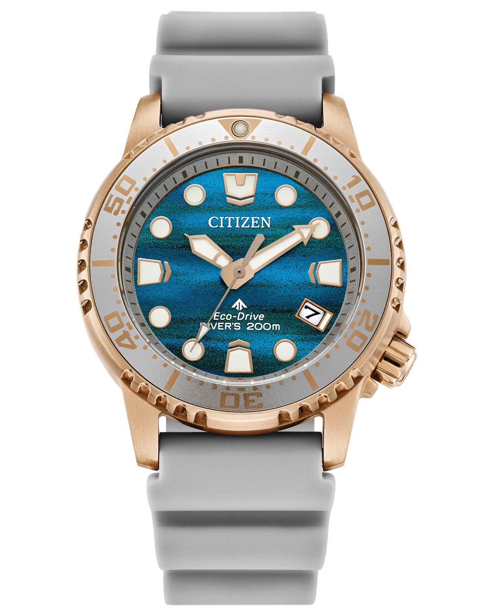 Az órát a Citizen házon belüli Eco-Drive E168-as óraműve hajtja, amely bármilyen fényforrástól feltöltve tartja az órát, és kiküszöböli az elemcserét. Az óra kompakt, 36,5 mm-es, rózsaarany színű rozsdamentes acél tokkal rendelkezik, így a Citizen kínálatának egyik viselhetőbb merülési opciója, különösen a kisebb csuklók számára, és egy növényi eredetű anyagból készült BENEBiOL PU szíjjal van felszerelve.