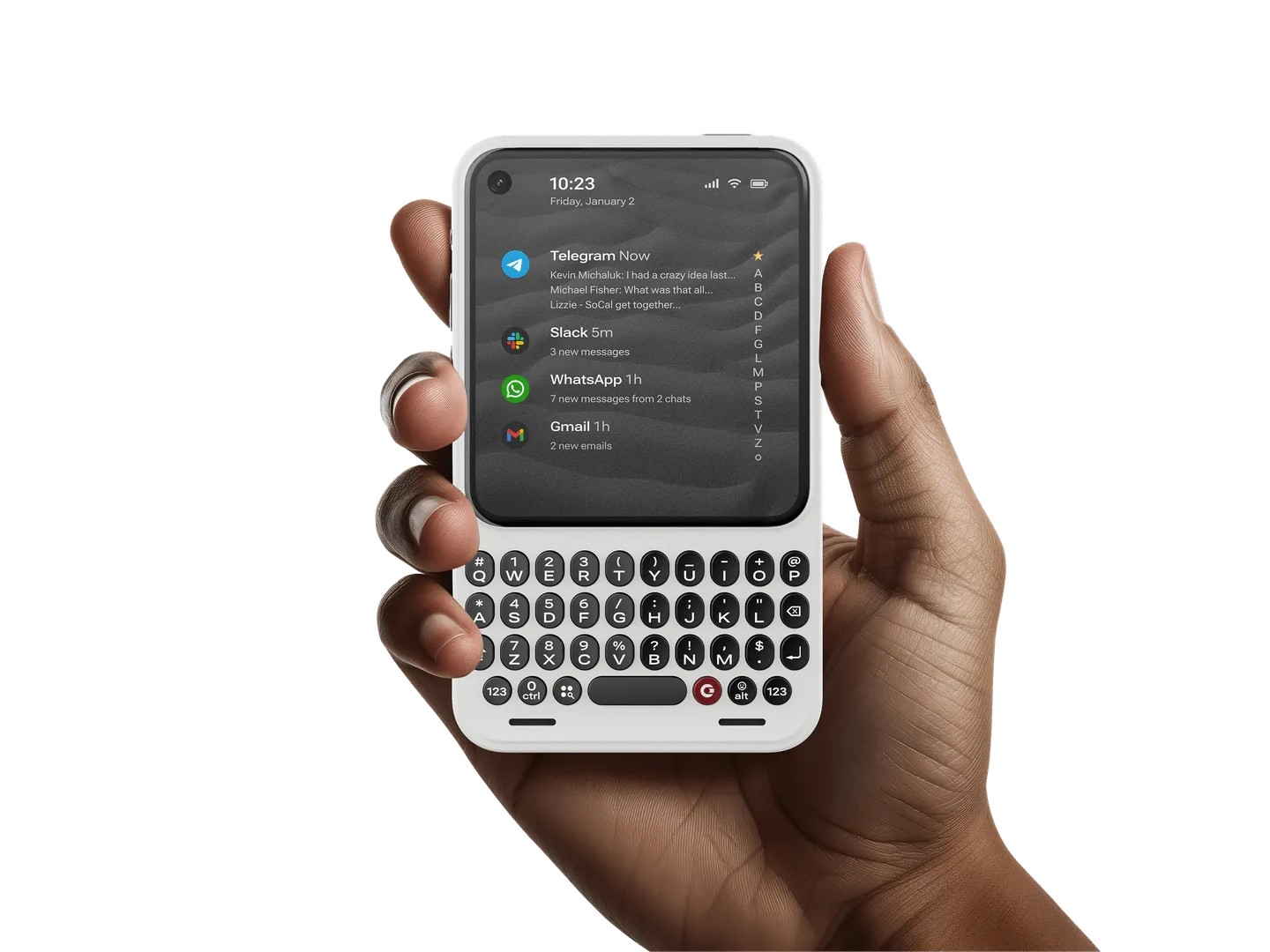 A jobb oldalon található egy fizikai gomb, az úgynevezett oldalsó billentyű, amely beépített, testreszabható LED-del rendelkezik. A felhasználók egyéni színt rendelhetnek egy adott kapcsolathoz vagy alkalmazáshoz. Az oldalsó billentyűt lenyomva tartva hangjegyzetet is rögzíthetnek, átírhatnak egy megbeszélést, vagy a hangot szöveggé alakíthatják.
