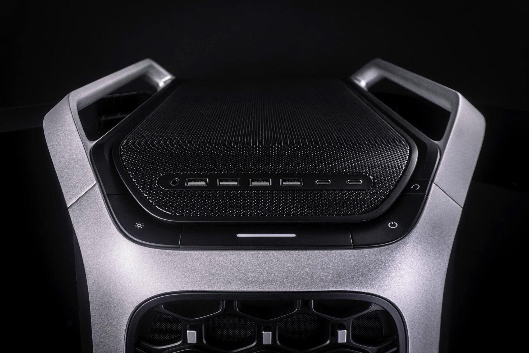 Az alján található LED-csíkok közvetett megvilágítást biztosítanak, amely a tok tetején található külön erre a célra szolgáló gombbal vezérelhető. Közvetlenül e gomb mellett négy USB-A port, két USB-C port és egy 3,5 mm-es fejhallgató-csatlakozó található. A csatlakoztatott fejhallgató mikrofonja a tokon található gomb segítségével némítható el. A Cooler Master még nem erősítette meg az összes specifikációt; a termékoldalt nem sokkal a megjelenés után lekapcsolták, de várhatóan hamarosan visszatér.