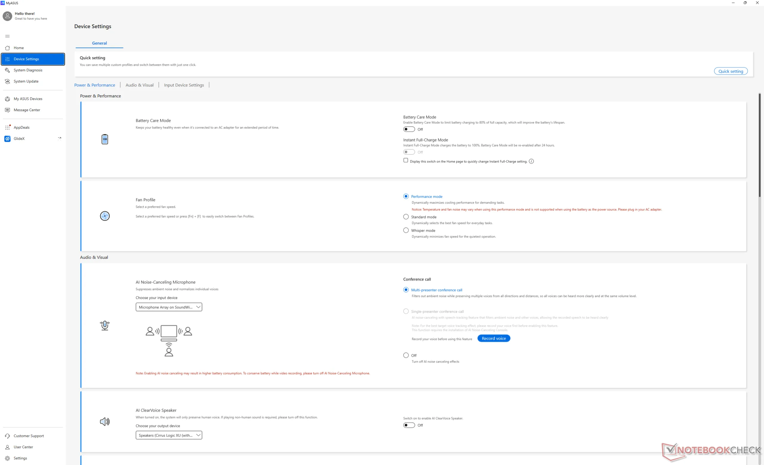 A Asus ExpertBook Ultraazonban a maximális processzorteljesítménynek egy feltétele van: a hálózati áramellátás. Amint az alábbi képernyőképek is mutatják, az akkumulátorral való futtatás nagyjából 10-15 százalékkal lassíthatja a teljesítményt. A MyAsus szoftver még ezt is megerősíti egy piros szöveggel, amely szerint "ez a teljesítmény üzemmód nem támogatott, ha az akkumulátort használjuk áramforrásként".