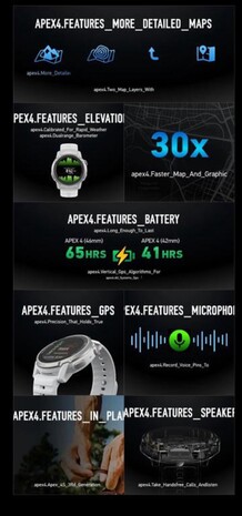 Az egyik ilyen marketingkép szerint a Coros Apex 4 30-szor nagyobb teljesítményt nyújt a térképek használata és a grafika renderelése során, míg maguk a térképek várhatóan több adatot tartalmaznak majd, mint korábban. A Coros állítólag egy továbbfejlesztett "kettős tartományú barométert" használ a magasság pontosabb meghatározásához, és a GPS-modullal kombinálva még pontosabban meghatározza a felhasználó helyzetét.