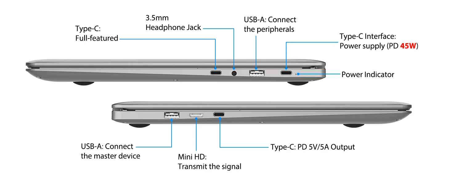 A billentyűzetkiosztás QWERTY, beleértve a numpadot és az érintőpadot is. A készülék USB-C-n keresztül képes elektromos áramot és képjeleket is fogadni. Összesen három USB-C port és egy mini HDMI port található. A további portok között két USB-A port, egy jack kimenet és két hangszóró található. A modell tömege 1545 gramm, a mérete pedig 372 × 244 × 26 milliméter. További részletek a termékoldalon találhatók.