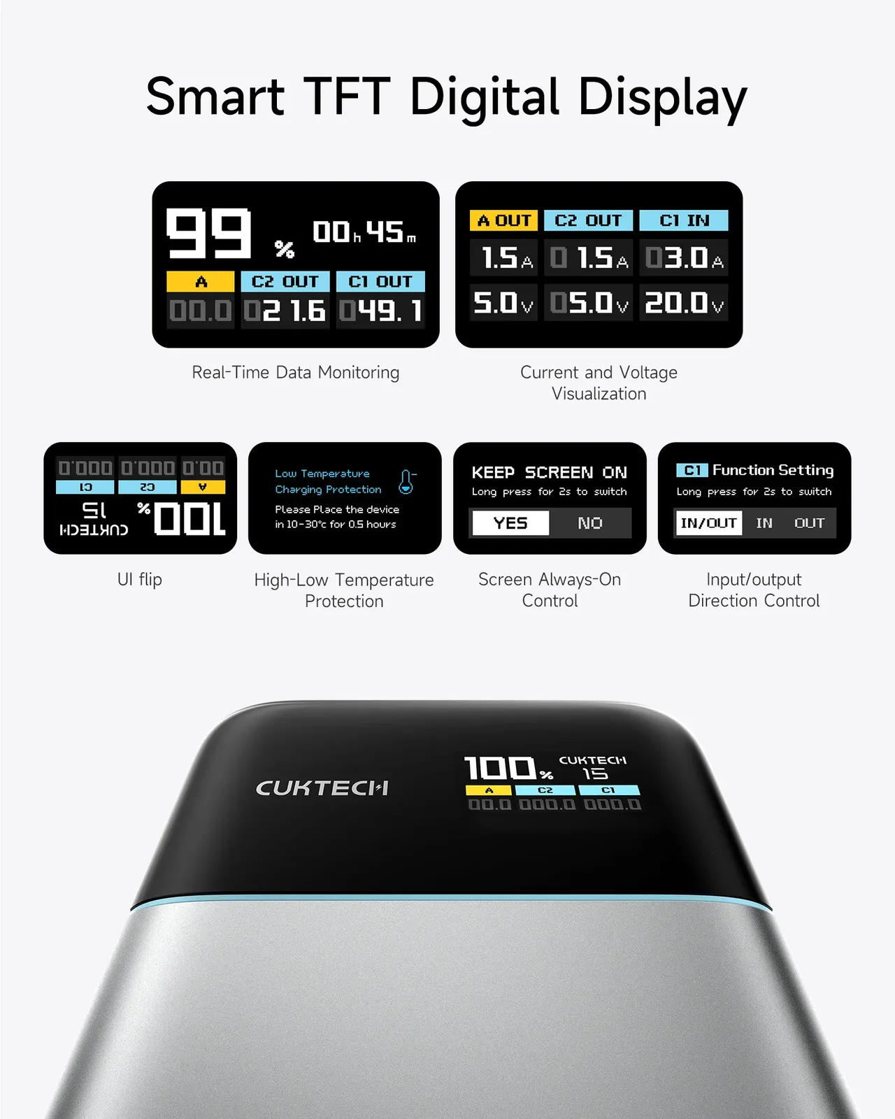 A felhasználók valós időben nyomon követhetik a töltést a beépített kijelző segítségével, amely képes nyomon követni a használat perceit, a powerbank töltöttségi szintjét, valamint a portonkénti áram- és feszültségszinteket.
