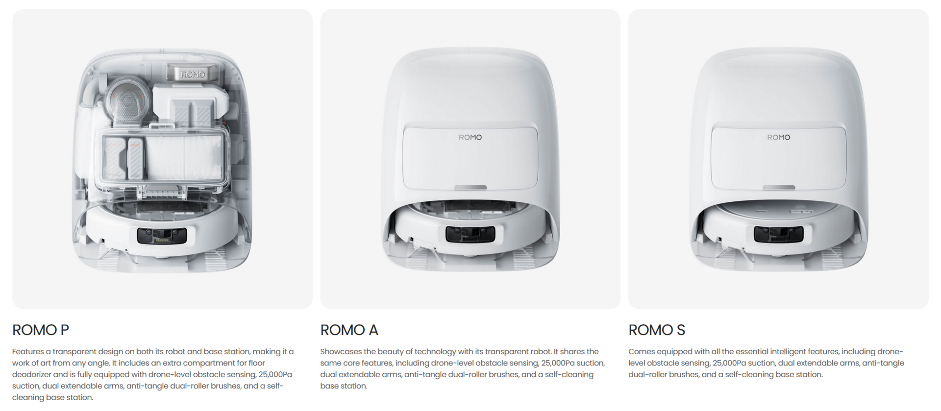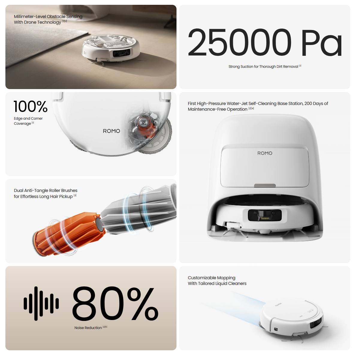 DJIa vadonatúj Romo az első multifunkciós robotporszívó, amely a vállalat drónjainak szenzor- és navigációs technológiáját veszi kölcsön. A termékcsalád a kemény padlók és szőnyegek alapos tisztítását célozza meg, három modellel, és nagy hangsúlyt fektet az akadályok elkerülésére, az önkarbantartásra és az erős szívásra.