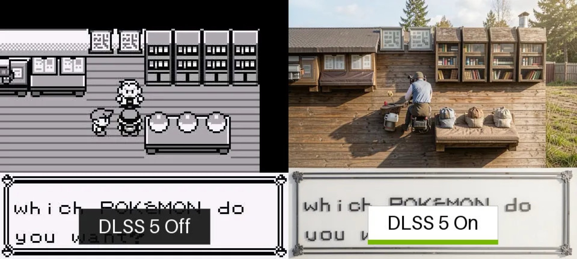 Minél valósághűbb a felhasznált kép, annál kisebb különbséget mutat a DLSS 5 Anything eredménye. Különösen a retro játékok esetében azonban az eredmények pontosan olyanok, mint amilyennek egy AI remake-et képzelünk. A Pokémon első generációjában az AI végül kideríti, hogy a Nintendo elfelejtett falakat tenni a szobákba, míg Pidgey és Pikachu valószínűleg mindketten jelmezes macskák