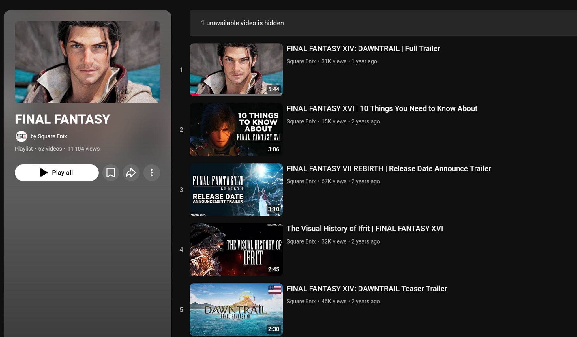 A YouTube lejátszási lista a népszerű RPG-sorozat főbb kiegészítőit népszerűsítő trailereket mutatja be. A Final Fantasy 14: Dawntrail bővítményhez készült videó volt az utolsó új válogatás, amelyet 2024-ben tettek közzé. A kiadók gyakran előre elkészítik a tartalmakat, de a médiát a leleplezésekig nem teszik közzé. Ennek ellenére a játékosok láttak már hasonló privát bejegyzéseket a Rockstartól, amelyek nem eredményeztek új GTA 6 trailer.