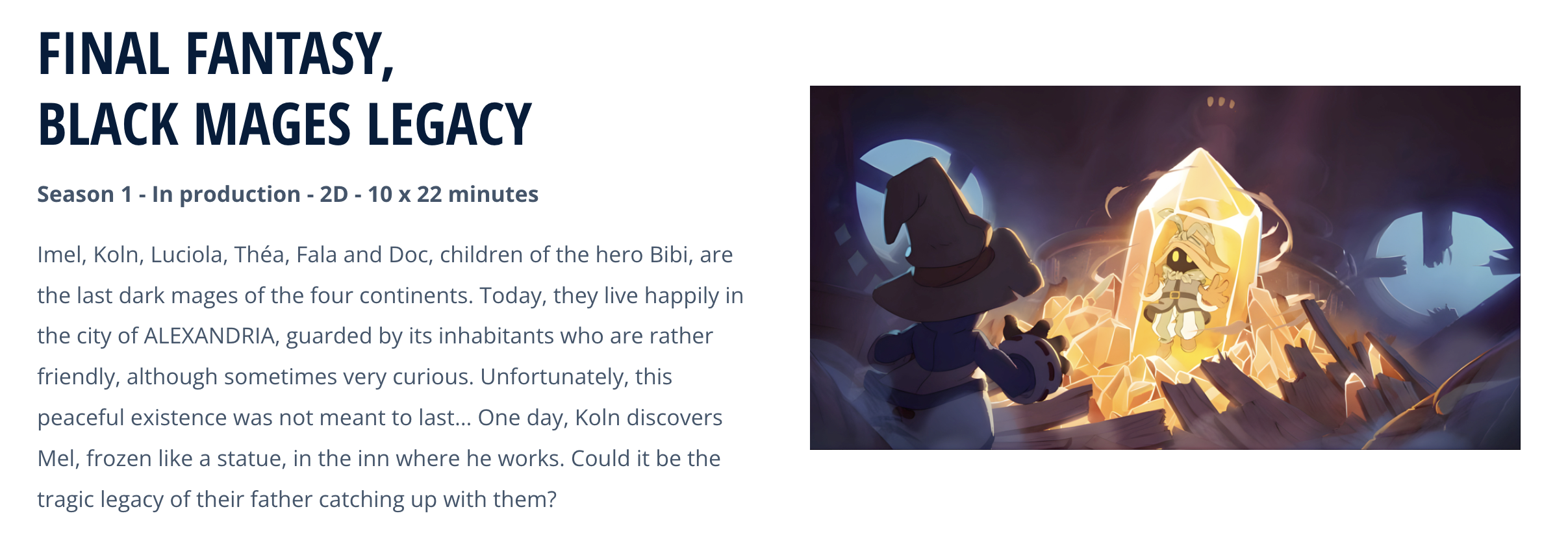 A sorozat a premisszát tekintve egy csapat fiatal fekete mágus történetét dolgozza fel, akiket Vivi-szerű karakterek gyermekeiként írnak le, és az eredeti játék eseményei után Alexandriában élnek. A történet egy konfliktus köré épül, amikor egyikük felfedez egy helyben megdermedt társat.