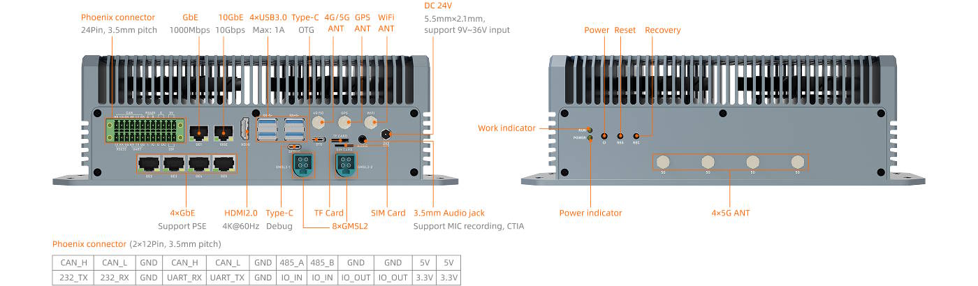A 277,95 x 136,09 x 88,0 milliméteres mini PC 64 GB LPDDR5 RAM-mal és 64 GB kapacitású eMMC-tárolóval rendelkezik. Egy M.2 2280-as formátumú M.2 SSD is beépíthető. A videokimenet HDMI 2.0-n vagy speciális GMSL2 csatlakozókon keresztül könnyíthető meg. A hálózati csatlakoztathatóság több 10 Gbps és 5 Gbps sebességű Ethernet porton keresztül lehetséges. A további portok közé tartoznak az USB 3.0, USB 3.2, Phoenix csatlakozók, RS485, RS232, CAN 2.0 és UART.