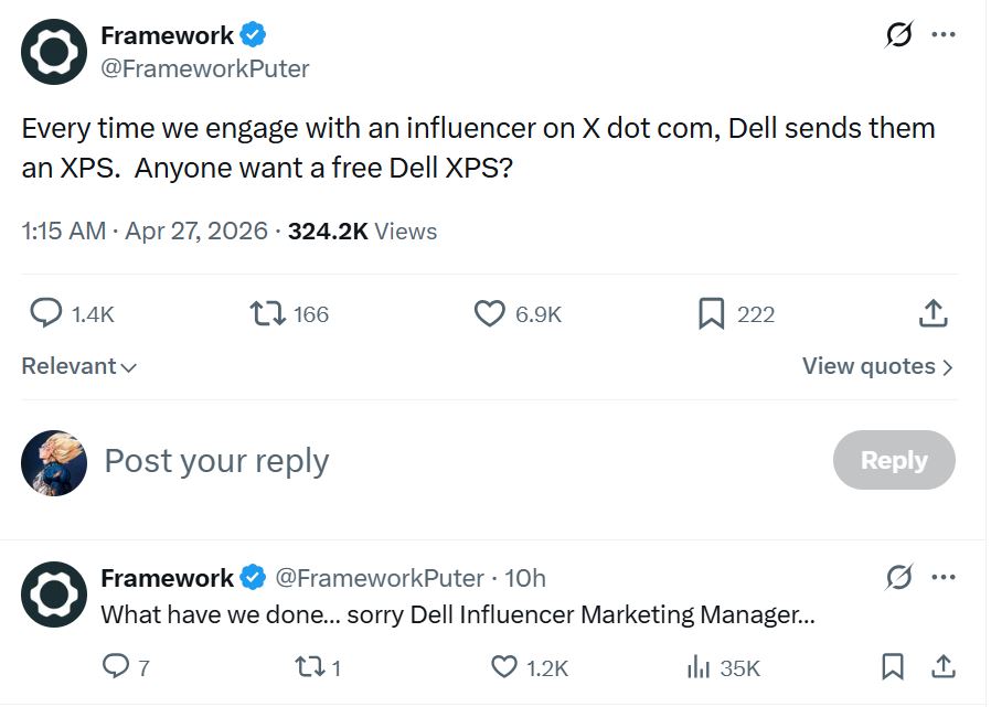 Természetesen úgy tűnik, hogy a jól ismert laptop OEM-ek most komolyan veszik a Frameworket. A Framework azt állítja, hogy "minden alkalommal, amikor az X dot com-on kapcsolatba lépünk egy influencerrel, a Dell küld nekik egy XPS-t". A poszt tisztességes forgalmat bonyolított le, a cikk írásakor több mint 320 ezer megtekintéssel. Ennek hatására sokan viccelődve kérték a Frameworket, hogy lépjen kapcsolatba velük abban a reményben, hogy kapnak egy XPS-t a Dell-től.