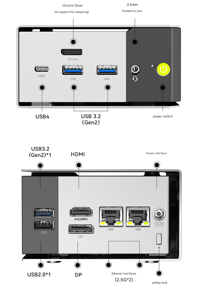 A jó hír az, hogy a GMK M8 rendelkezik OCuLink porttal, amely lehetővé teszi a felhasználók számára, hogy a mini PC-t egy eGPU-val párosítsák a jobb játékteljesítmény érdekében (GMKtec AD-GP1 jelenlegi ára 469,79 $ az Amazonon). Van egy USB4 port is, amely bővíti az eGPU-kompatibilitást, és lehetőséget kínál arra, hogy nagy sebességű kiegészítőket csatlakoztassunk a rendszerhez. Ami a többi portot illeti, ezek a következők: