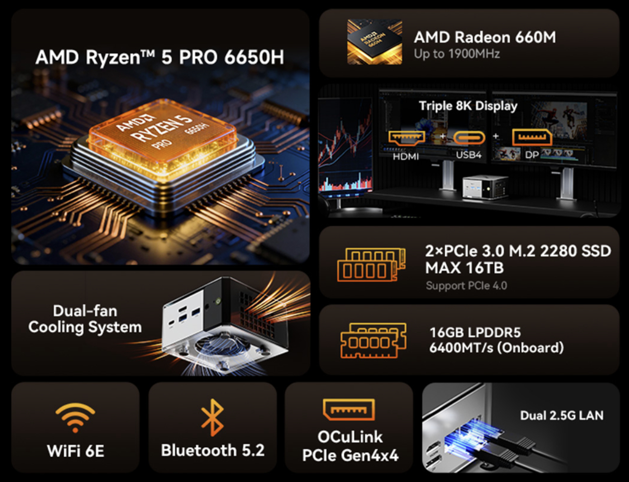 Mindezek mellett a GMKtec az M8-at a következőkkel látja el Ryzen 5 Pro 6650H helyett a Ryzen AI 9 HX 370 helyett helyett, amely az EVO-X1-ben található. A 6 nm-es APU hat Zen 3+ maggal és egy Radeon 660M iGPU-val rendelkezik, a Ryzen 5 Pro 6650H messze elmarad a Ryzen AI 9 HX 370 a CPU-összehasonlító teszteken, és játék közben még inkább lemarad. Ennek eredményeképpen a GMKtec M8 jelenleg 329,99 dollárról indul, 16 GB RAM-mal és 512 GB tárhellyel. Állítólag 150 dolláros bevezetési kedvezménnyel, ez a konfiguráció mindössze 30 dollárral olcsóbb, mint ugyanennek az eszköznek az 1 TB tárhelyet tartalmazó változata. Lásd a GMKtec weboldalát további részletekért.