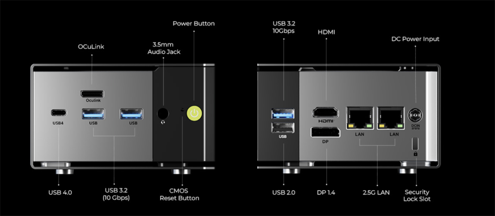 Elsőként a hasonlóságokkal foglalkozva, a GMKtec M8 előlapi OCuLink, USB4 és kettős USB 3.2 Type-A porttal rendelkezik. Ahogy a fenti és az alábbi képeken látható, ezek mellett egy 3,5 mm-es jack-csatlakozó, egy CMOS reset gomb és egy bekapcsológomb is található, utóbbi jobb oldali szélénél jobbra tolva. Emellett a GMKtec egy lebegő fémkeretet is beépített a már meglévő EVO-X1.