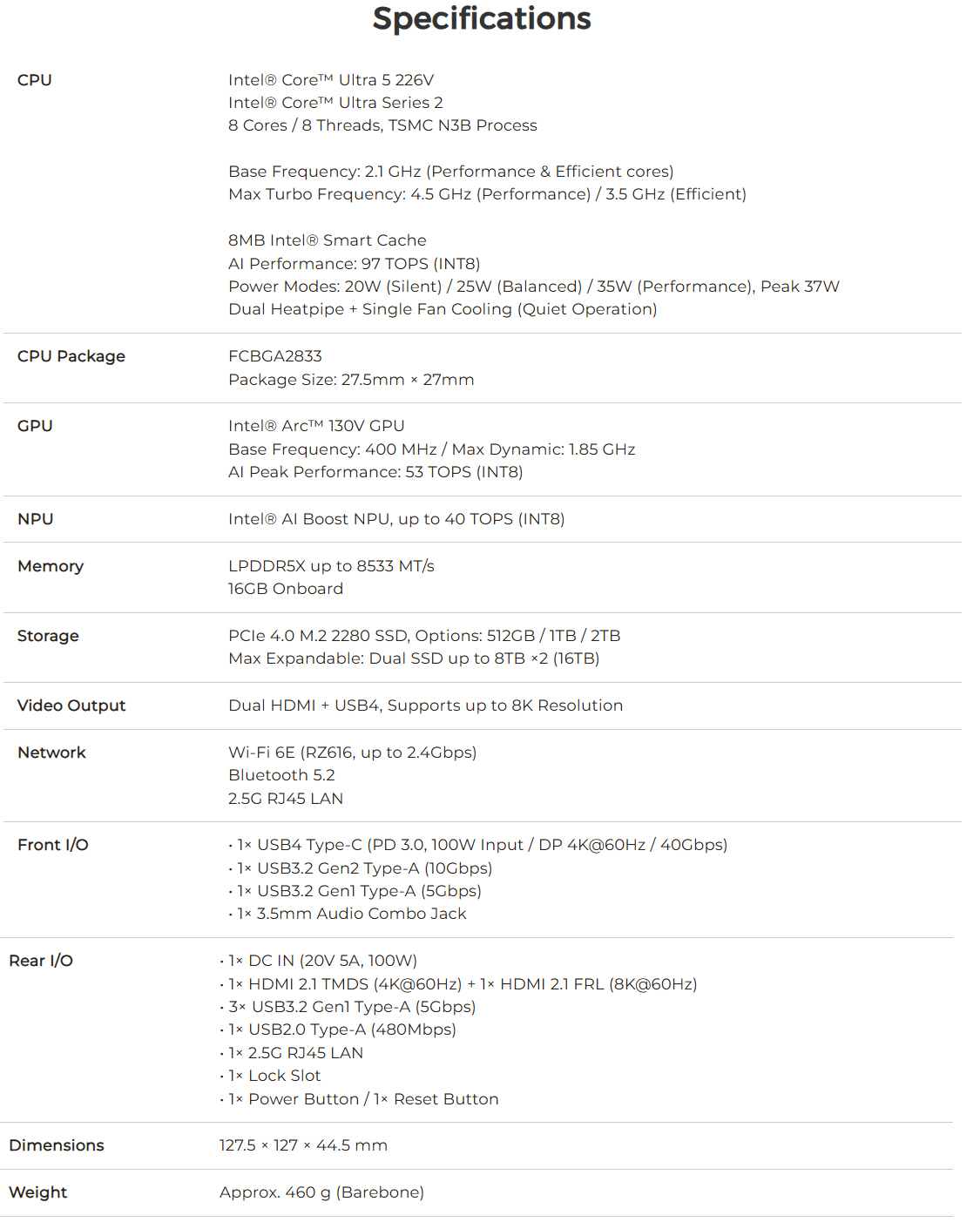 A motorháztető alatt a NucBox K17 az Intel Core Ultra 5 226V-vel rendelkezik, amely egy belépő szintű processzor a Lunar Lake termékcsaládból. Ez a CPU a következő jellemzőkkel rendelkezik arc 130V iGPU, amely 1080p felbontásnál a Radeon 780M-hez közeli játékteljesítményt képes nyújtani.