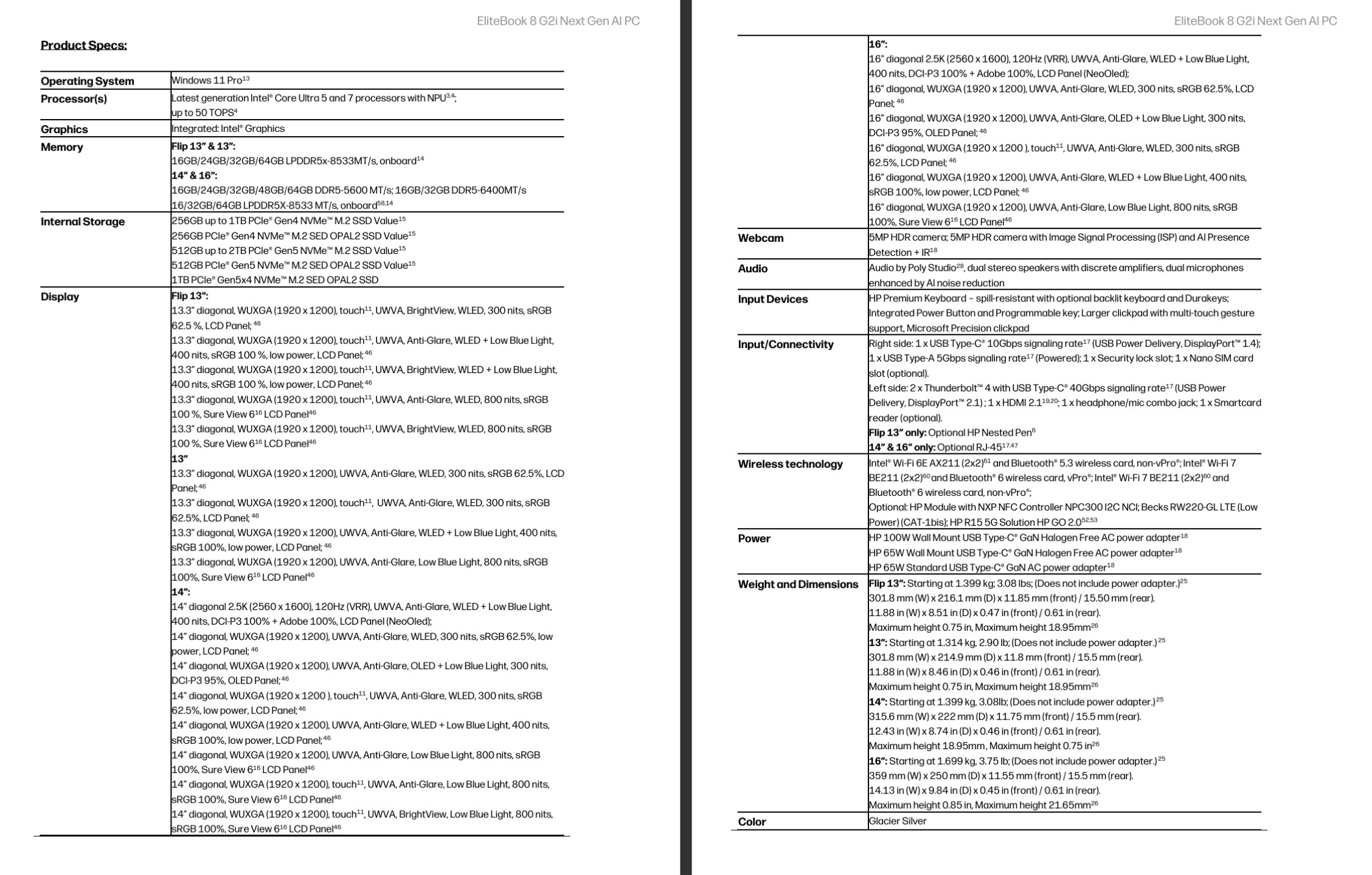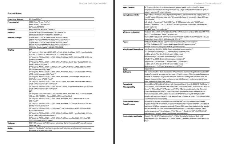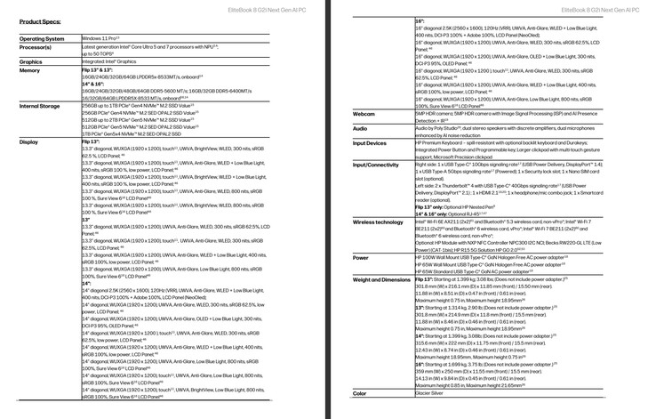 Minden változat konfigurálható lesz több panellel, akár 2,5K-ig, valamint 120 Hz-es VRR opcióval minden 14 és 16 hüvelykes változat esetében. A HP megerősítette, hogy IPS és OLED panelek is elérhetőek lesznek a megjelenéskor. További különbségek közé tartozik a forrasztott LPDD5X-8533 RAM egyes SKU-k esetében és a felhasználó által bővíthető DDR5-5600 vagy DDR5-6400 RAM mások esetében.