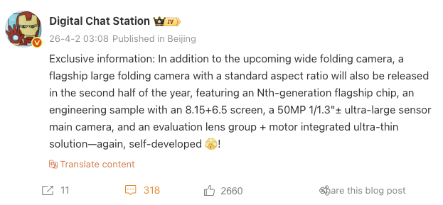 Továbbá a szivárogtató megemlíti, hogy a Huawei Mate X8 egy "N-edik generációs zászlóshajó chip" fogja hajtani, amely valószínűleg a Kirin 9040 Pro lesz, a Mate X7 Kirin 9030 Pro utódja. A közelgő összecsukható állítólag 50 MP-es, 1/1,3 hüvelykes, nagyméretű szenzorral rendelkezik majd a fő kamera számára. Nagyjából ennyi a szivárogtató által megosztott információ.