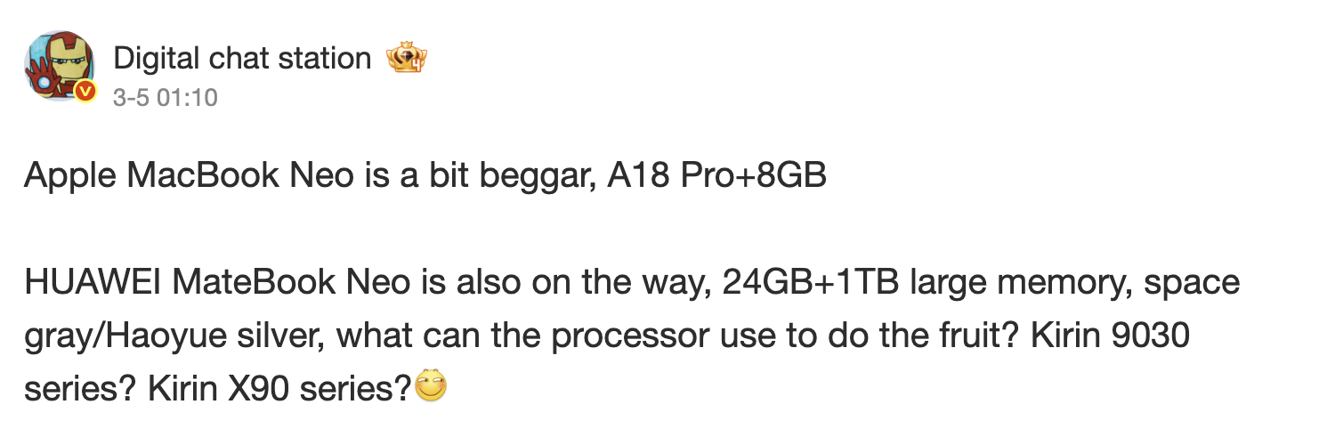 Ezenkívül a Kirin 9030 Pro a tervek szerint a MateBook Neo akár 24 GB RAM-ot és 1 TB tárhelyet is biztosít a MateBook Neo számára. Ezzel szemben a Apple csak 8 GB egyesített memóriával és 256 GB vagy 512 GB tárhellyel kínálja a MacBook Neót. Kérjük, tekintse meg macBook Neo bemutató cikkünket a Apple olcsóbb MacBookjáról további részletekért.