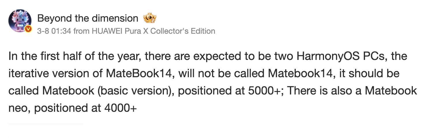 Állítólag a Huawei egy közvetlen alternatívát tervez kínálni MateBook Neo néven. Először a Digital Chat Station említette januárban, a MateBook Neo egy felfrissített MateBook 14 mellett jelenhet meg. Hogy pontosan mikor, azt azonban egyelőre nem tudni. A Hyperdimensional Realm mégis arra számít, hogy a Huawei a MateBook Neo-t 4000 CNY (~575 dollár) körüli áron kínálja majd, a következő MateBook 14-nél cirka 1000 CNY-val (~145 dollárral) olcsóbb indulóárral.