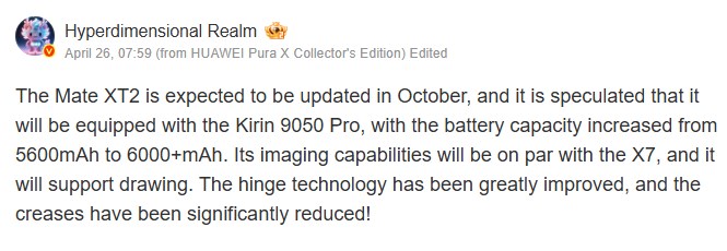 A Hyperdimensional Realm nevű tippadó szerint a Huawei a Mate XT2-t idén októberben tervezi piacra dobni a Weibón. Bár a vállalat egyelőre semmit sem erősített meg, a szivárgás alapján jó képet kaphatunk arról, hogy mire számíthatunk a készülő készüléktől.