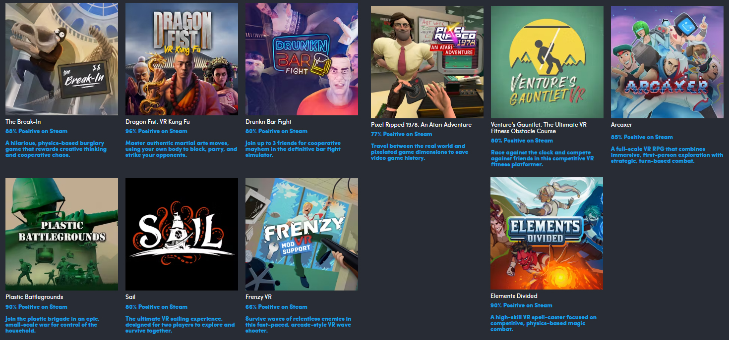 - The Break-In - vR és normál módban is játszható, ez egy négyjátékos kooperatív játék amely a szórakoztató betöréses futásokról szól. A 2025-ben indult játék 19,99 dollárt ér, és jelenleg "Nagyon pozitív" játékosértékelést kapott.