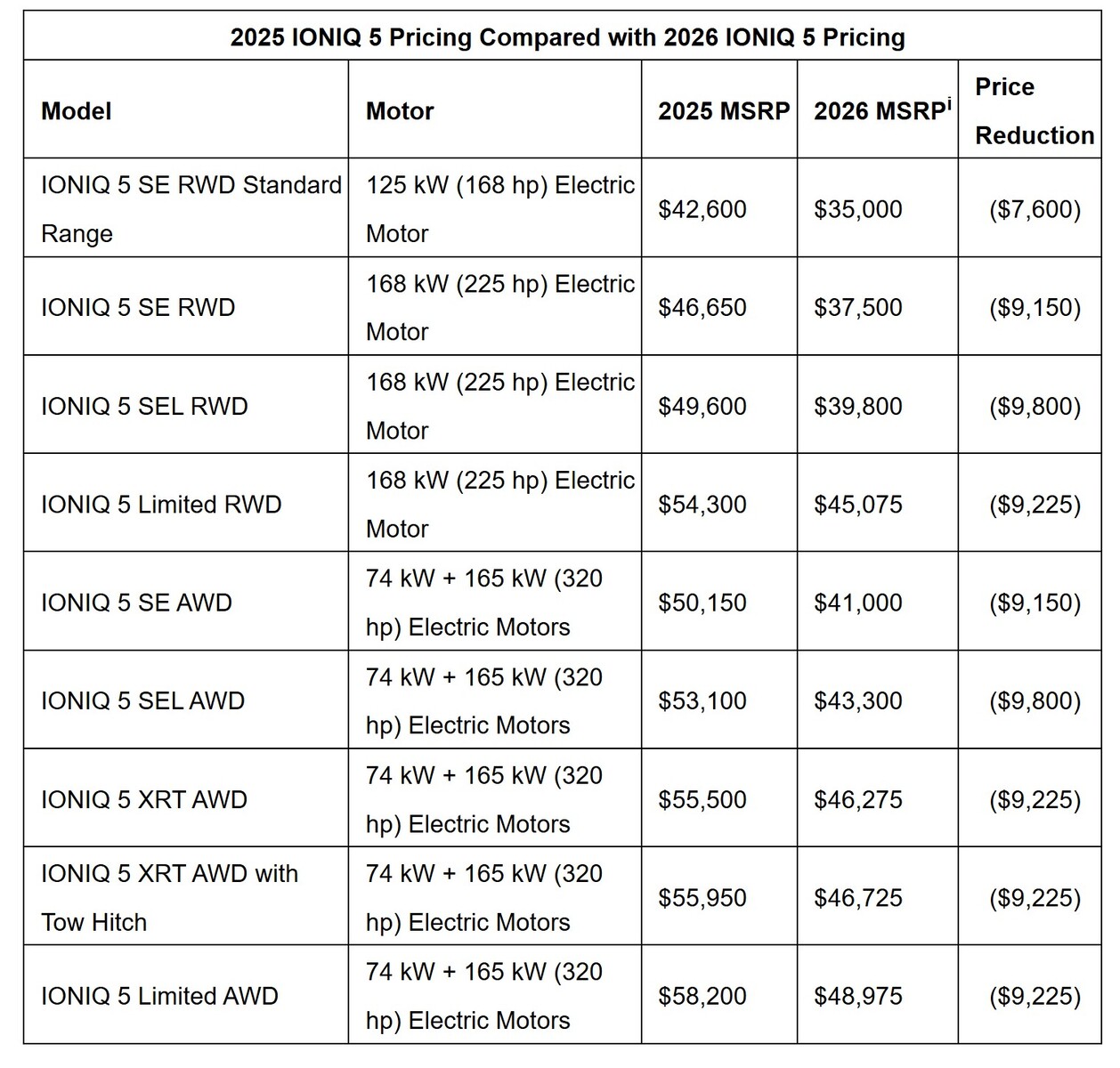 A legnagyobb 2026-os Ioniq 5 árcsökkentés a 318 mérföldes hatótávolságú és 320 LE teljesítményű SEL AWD felszereltségre vonatkozott, amely most 53 100 dollárról 43 300 dollárra csökkent. Ezen kívül 11 000 $-os kiskereskedelmi bónusz készpénz akciót is kínálnak a kereskedők készletében lévő kiválasztott 2025-ös Ioniq 5 járművekre, amennyiben azokat 2025. október 1. és november 3. között szállítják le.