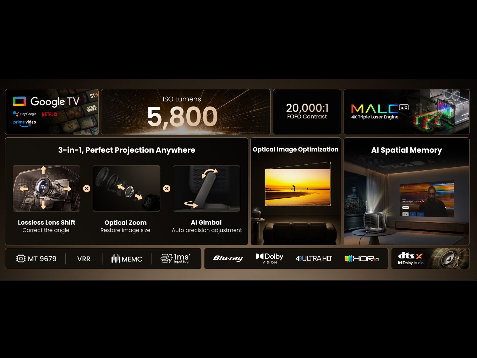 A további intelligens funkciók közé tartozik az automatikus képernyőillesztés, az autofókusz, az akadályelkerülés, a fal színadaptációja és a szemvédelmi mechanizmusok, amelyeket valós idejű AI-beállítások segítségével kezelnek. A kivetítő Google-alapú rendszeren fut, és 4 GB RAM-ot tartalmaz 64 GB belső tárolóval.