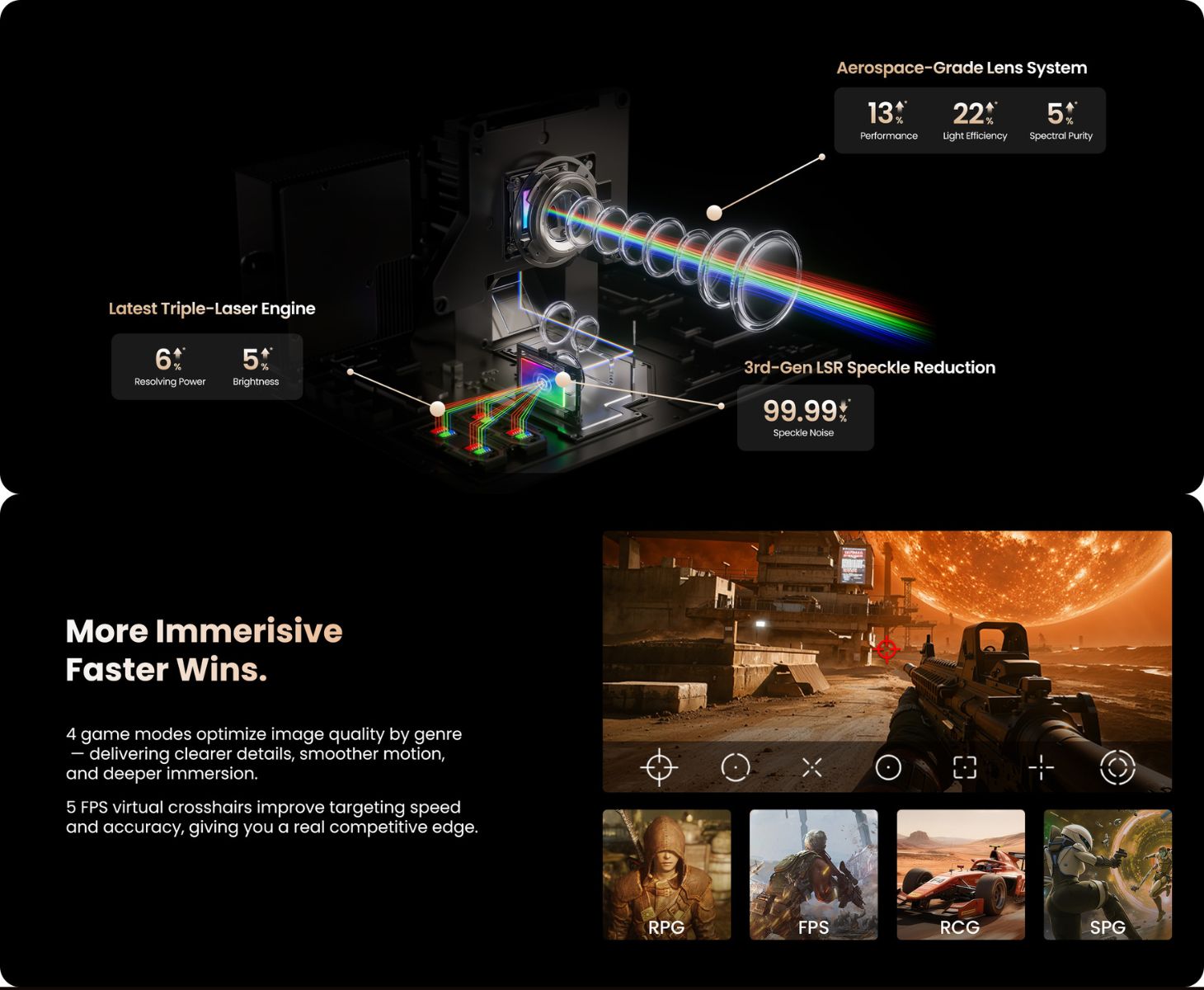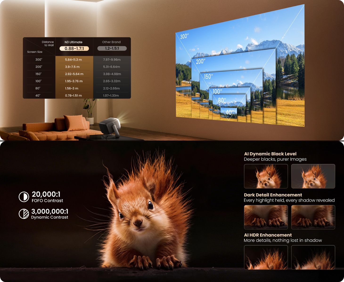 Ami a képminőséget illeti, az N3 Ultimate háromlézeres fényforrást használ, és 4K felbontást biztosít, 110%-os BT.2020 színskálával és 0,7 körüli Delta E értékkel. A kivetítő emellett 20 000:1 kontrasztarányra van méretezve, és támogatja a Dolby Vision és a HDR10, valamint a Dolby Audio és a DTS-X hangkimenetet.