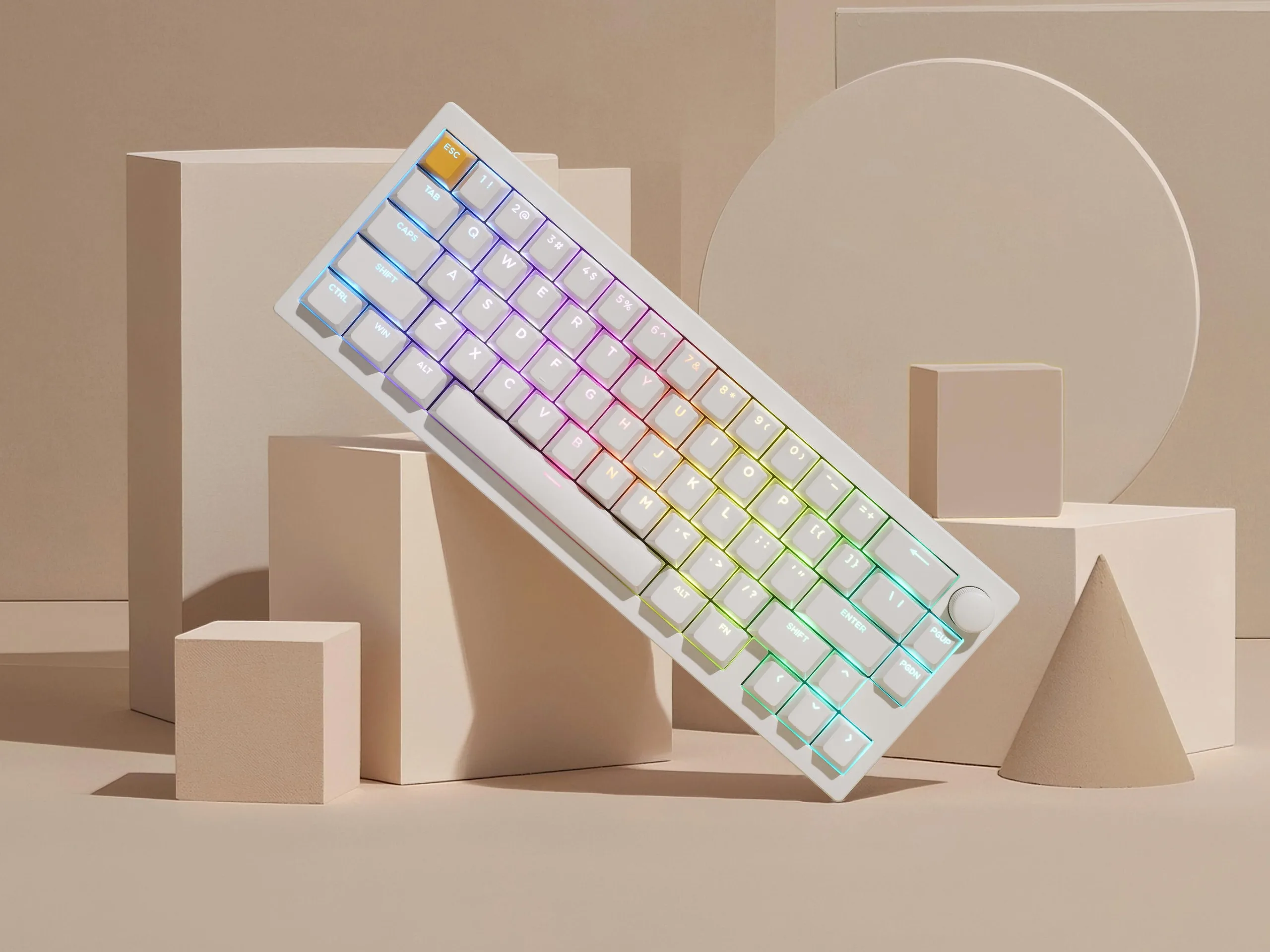 A Lemokey P2 HE kompakt, 65%-os elrendezéssel rendelkezik, testreszabható hangerőgombbal, bár van némi távolság az alsó sor módosító billentyűi és a nyílcsoport között, így valószínűleg könnyebb lesz megszokni, mint a megfelelő kompakt elrendezést, amivel a mi tesztünkben küzdöttünk Lofree Flow Lite felülvizsgálat. A P2 HE másik fénypontja, hogy a P2 HE az ismerős Cherry-profilú billentyűsapkákkal van felszerelve, amelyek dupla lövéses PBT-ből készültek. A Lemokey a P2 HE-t fekete és fehér színben is kínálja, és mindkét opcióban van lehetőség átvilágított billentyűsapkákra, ami jól párosul az északi irányú, billentyűkönkénti RGB háttérvilágítással.