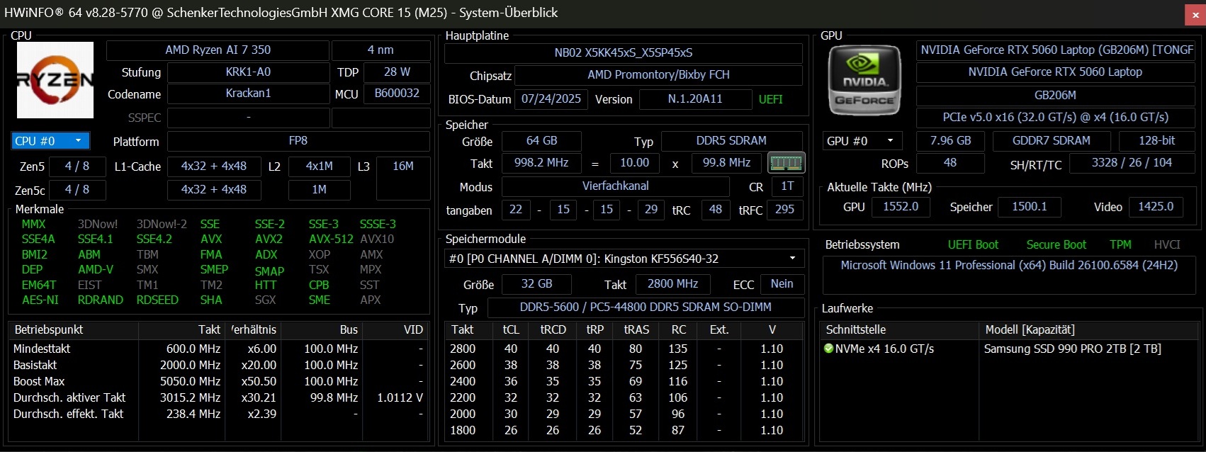 SCHENKER XMG Core 15 (M25) AMD Ryzen AI 7 350 ⎘ Nvidia GeForce RTX 5060 Laptop ⎘ 64 GB Memória, 2048 GB SSD | List Price: 1840 EUR | 1.9 kg | 22 mm | 15.30" 2560x1600 197 PPI IPS | |