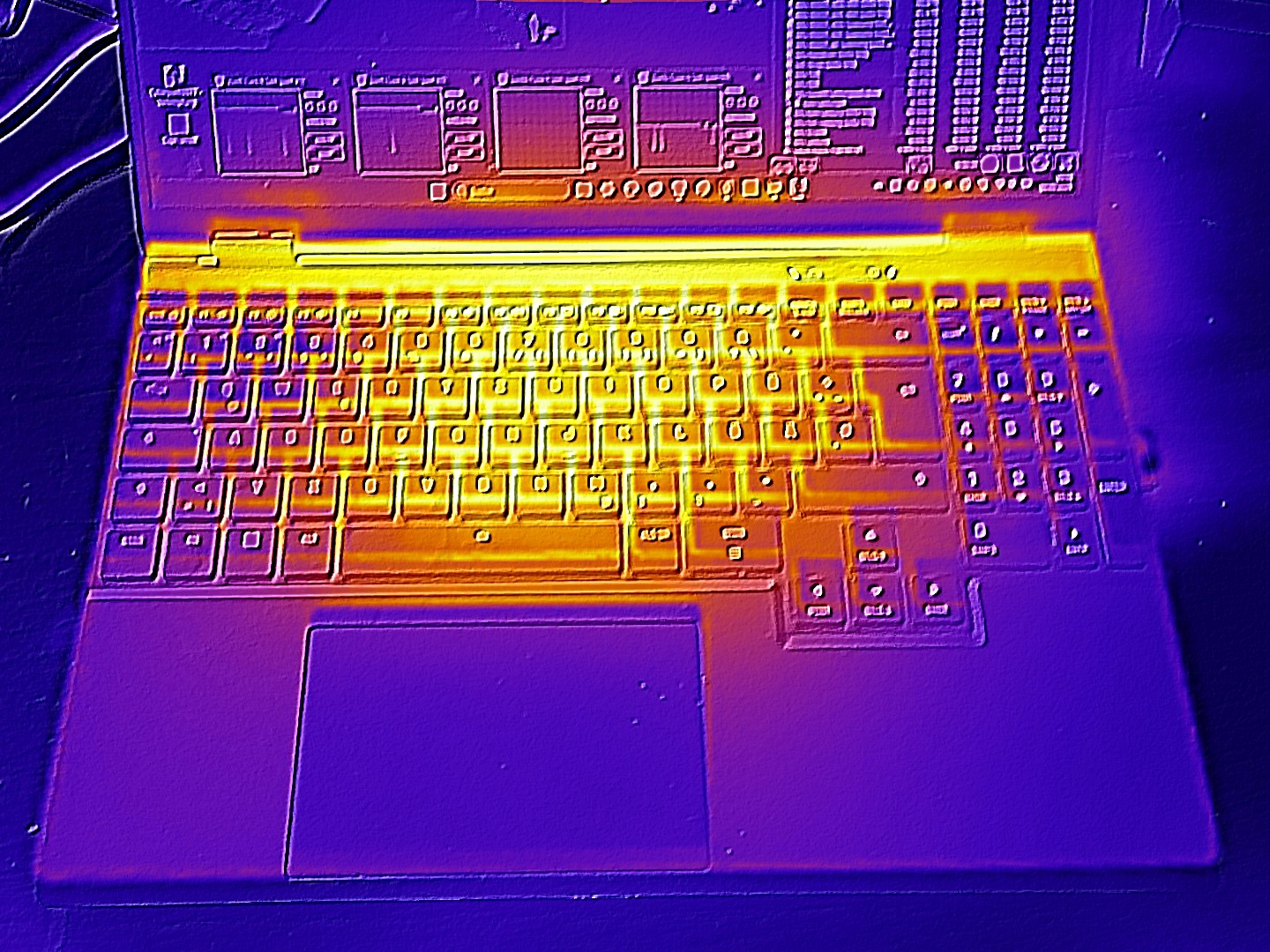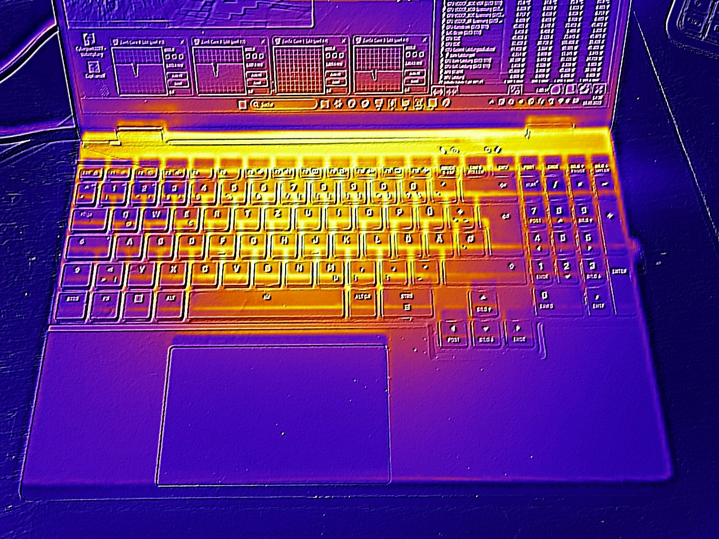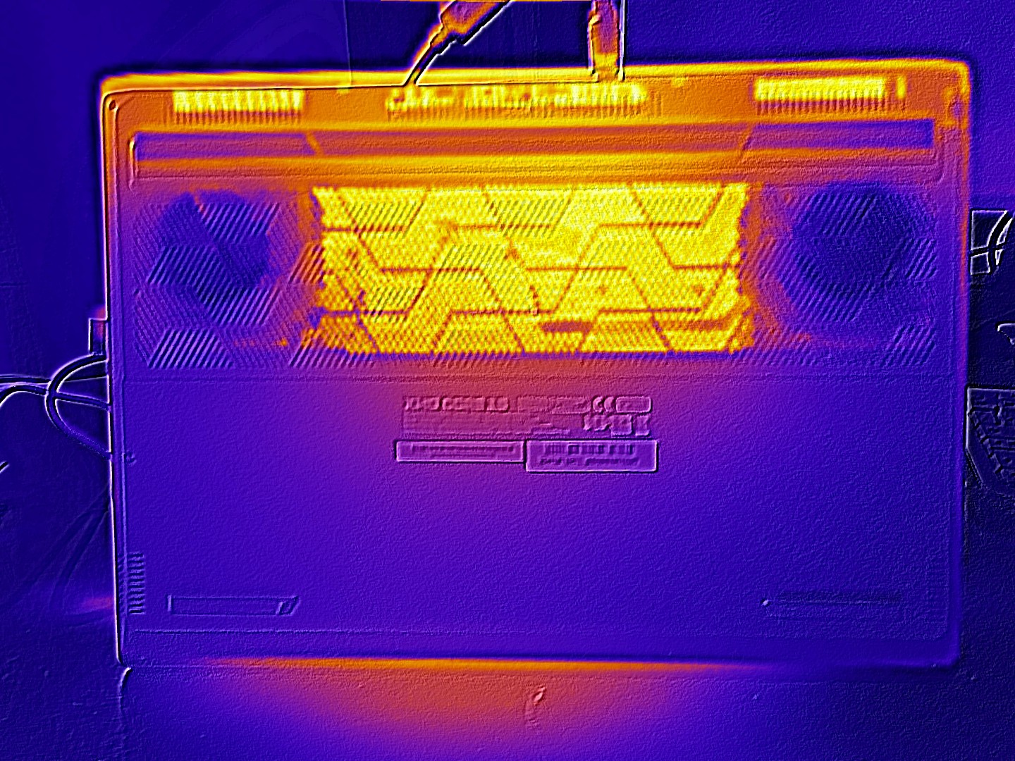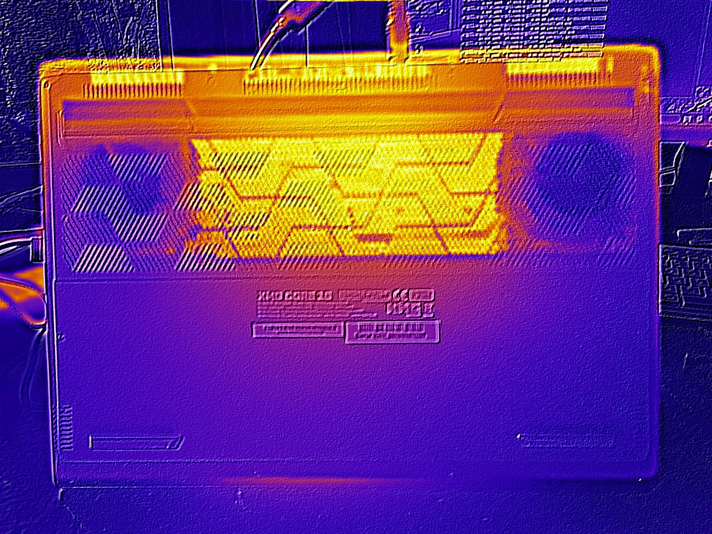 A hőmérsékleti eredmények vegyesek. Míg üresjáratban az alváz többnyire 30 °C alatt marad, terhelés alatt a felületi hőmérséklet felül közel 50 °C-ra, alul pedig 60 °C-ra emelkedik. Ezek az értékek hasonlóak a Lenovo LOQ 15-höz, míg a Legion 5 hűvösebb futású.