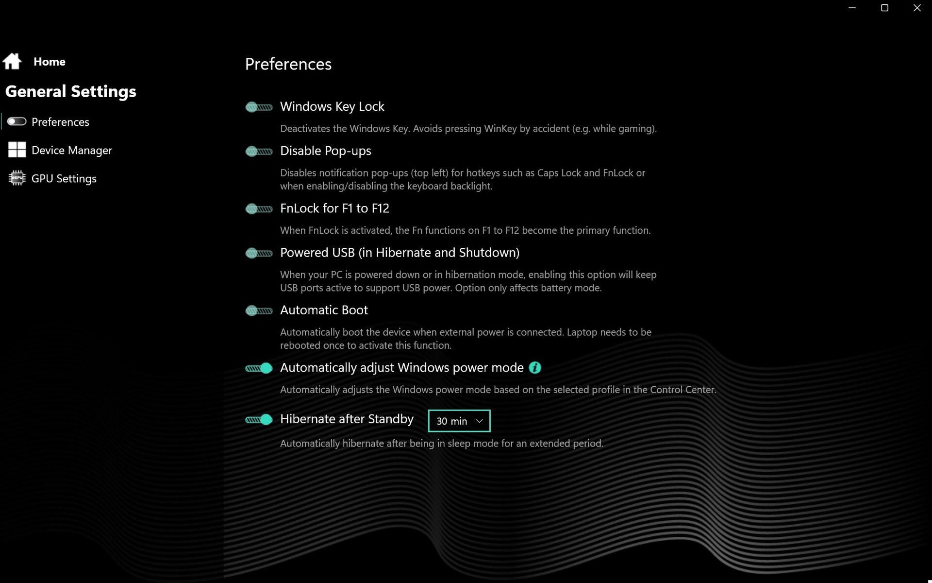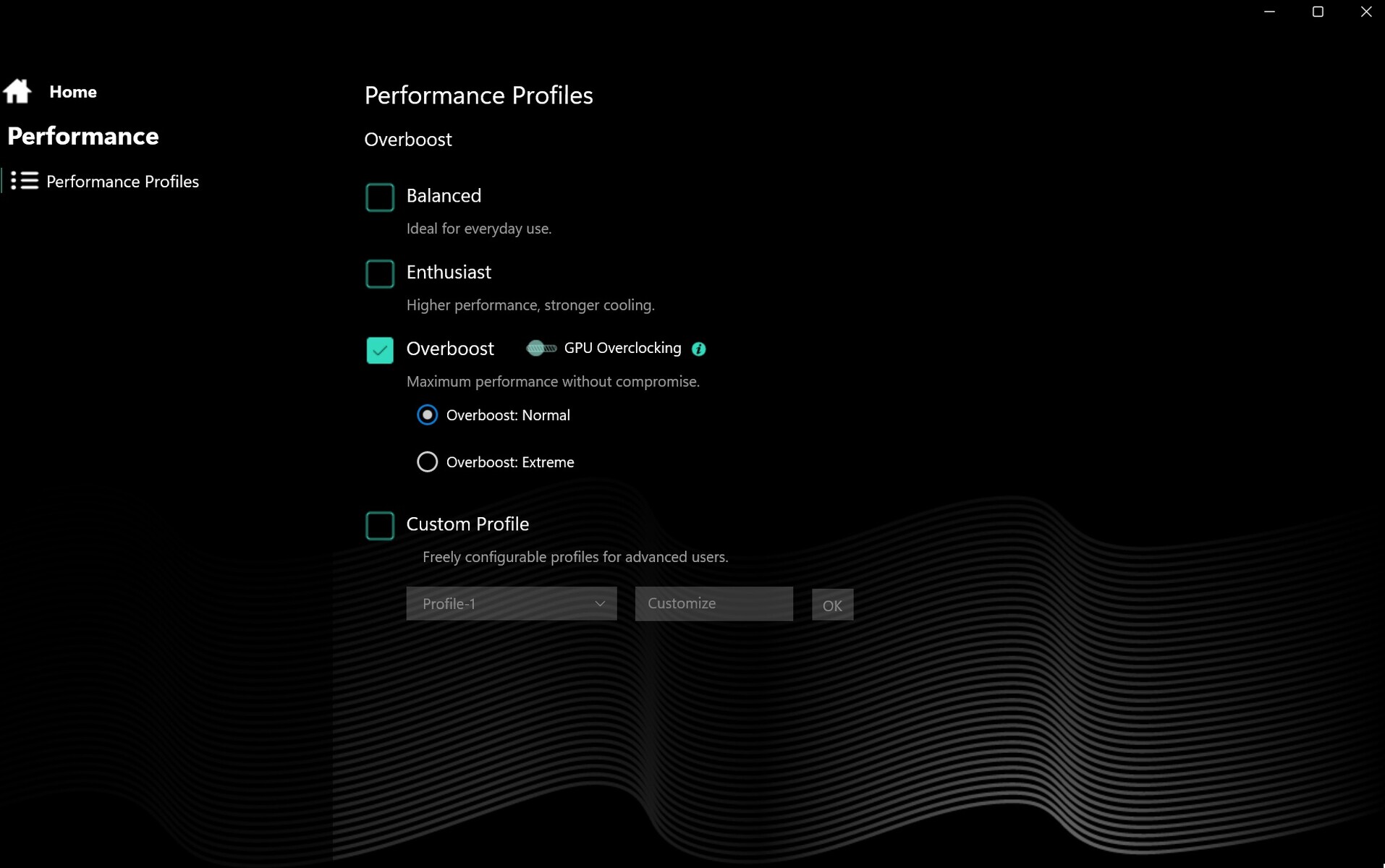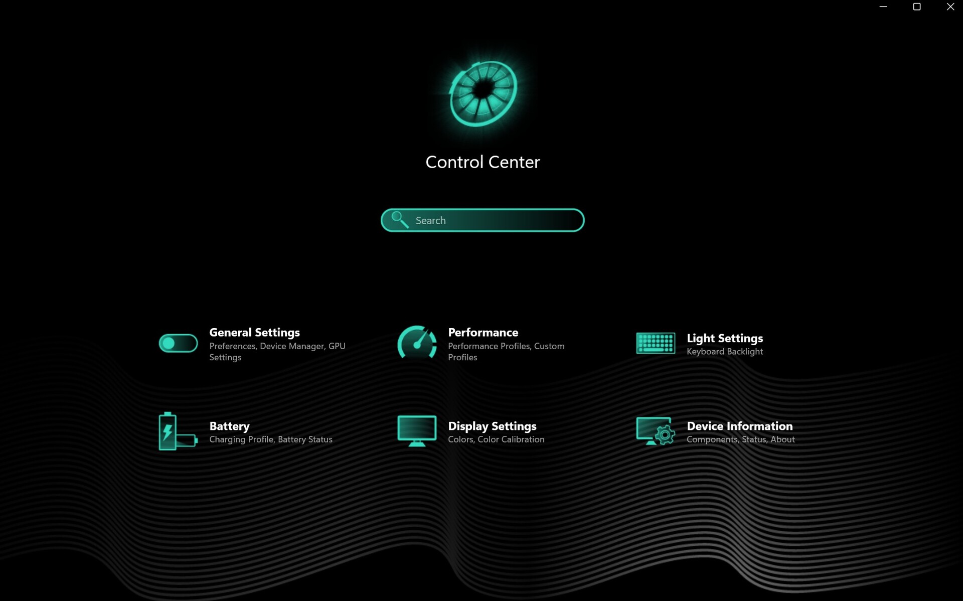 Az előre telepített Vezérlőközpont számos funkciót és beállítást kínál. A játékosokat leginkább a teljesítmény menü fogja érdekelni, amely három profilt kínál (lásd a táblázatot). Az akkumulátorteszt kivételével minden mérés Overboost üzemmódban készült, a GPU túlhajtásának kikapcsolásával. Igény esetén egyéni profil is létrehozható.