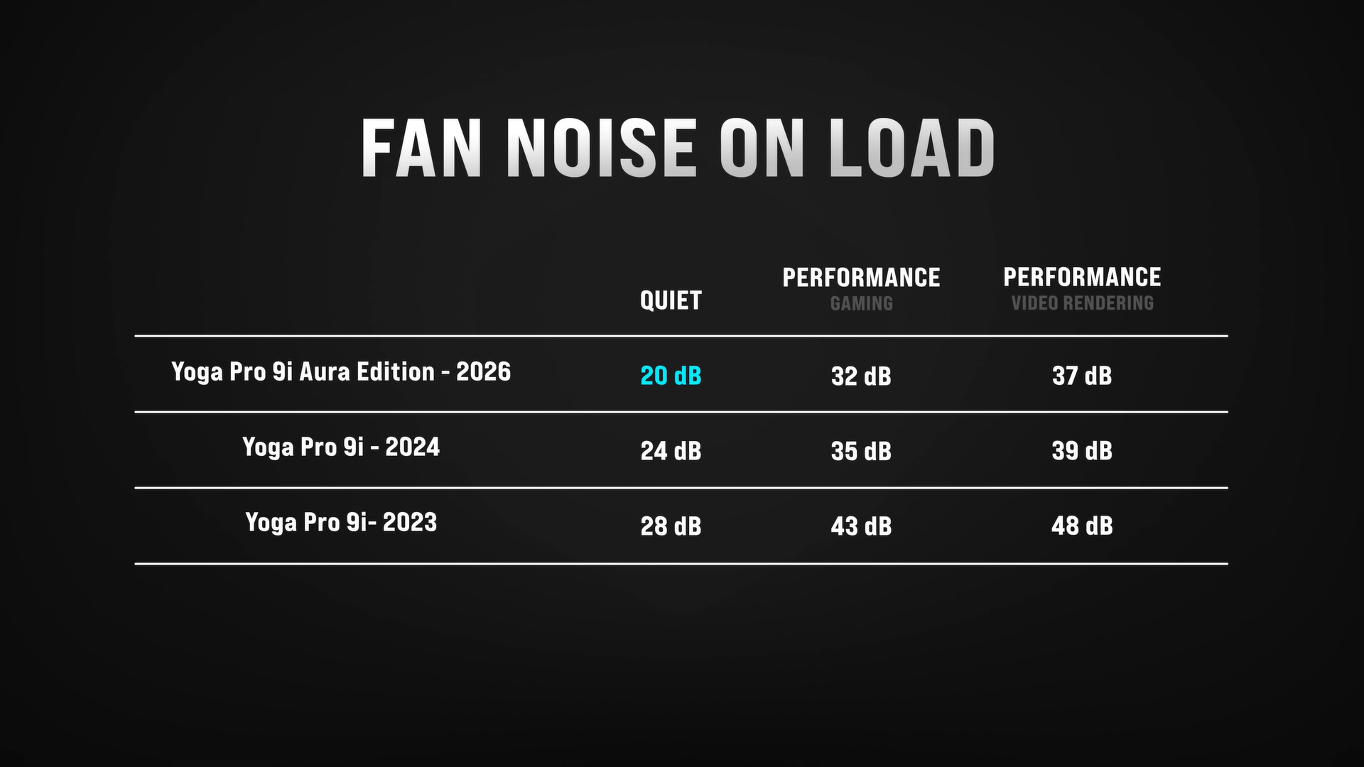 Konfigurálható akár egy Intel Core Ultra 9 386H CPU-val és a RTX 5070, a Yoga Pro 9i Aura Edition 2026 célja, hogy egy nagy teljesítményű multimédiás noteszgép legyen. Dave2D szerint, miközben a Yoga Pro 9i Aura Edition (2026) dGPU nélkül is jól teljesít, a laptop lenyűgözően csendes is. A Dave2D jelentése szerint a laptop terhelés alatt csak 20 db zajt bocsát ki "Csendes" üzemmódban. Összehasonlításképpen a 2024 és a 2023 Yoga Pro 9i laptopok észrevehetően hangosabbak, 24 db, illetve 28 db.