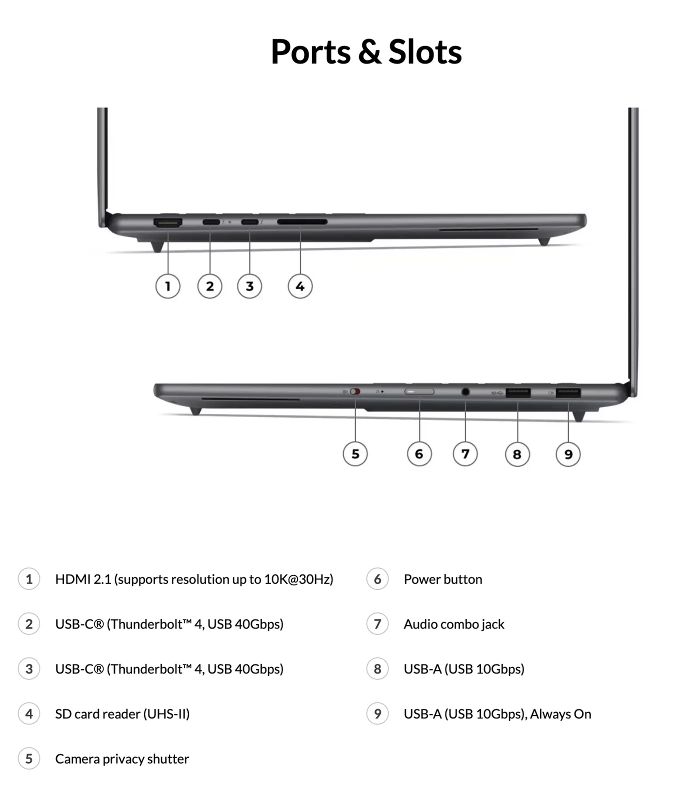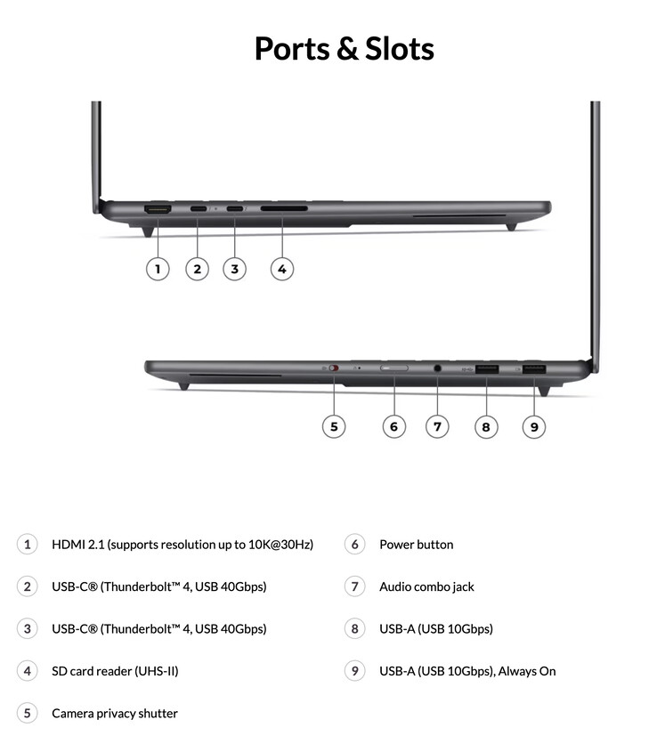 A Gen 11-es kiadás továbbá olyan portokkal rendelkezik, mint a kettős Thunderbolt 4 csatlakozási lehetőség, egy teljes méretű UHS-II kártyaolvasó és két USB Type-A port. A Yoga Pro 7i Gen 11 Aura Edition jelenleg az Intel Core Ultra 7 356H vagy Core Ultra 9 386H processzorokkal Nvidia GeForce RTX 5050 és GeForce RTX 5060 laptop GPU-kkal.