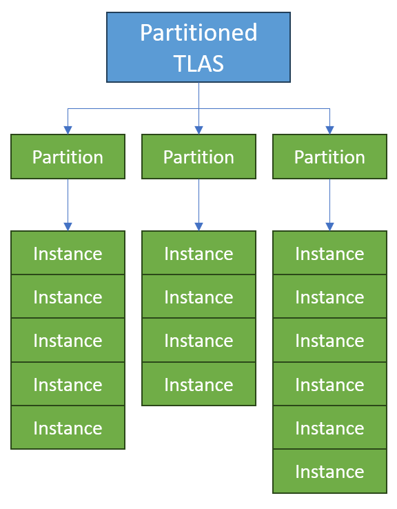 A particionált TLAS ugyanazt a módszert alkalmazza a klaszterezett geometria esetében, és a játék díszletére is alkalmazza. Ebben az esetben a teljes játékjelenet kisebb csoportokra particionálható, amelyeket a GPU könnyebben tud manipulálni az új sugárkövetési elemekkel. Ez jelentősen felgyorsítja a sugárkövetési teljesítményt, mivel a GPU a teljes jelenetből csak a látható vagy szükséges elemeket tudja sugárkövetni.