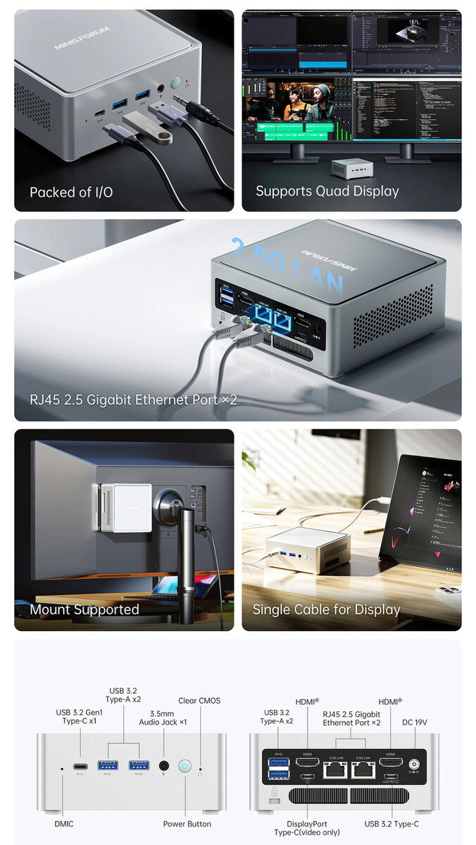 A NAB3R továbbá támogatja a bővíthető tárhelyet és RAM-ot, bár ez utóbbi esetében csak 64 GB DDR4-3200-ig. Ennek ellenére a Minisforum aktív hűtési megoldást épített be a mini-PC M.2 2280 SSD-jének, valamint egy nagy turbóventilátort az alján. Ahogy az alábbi képen is látható, a NAB3R hátoldalán sem szűkölködik portokban.