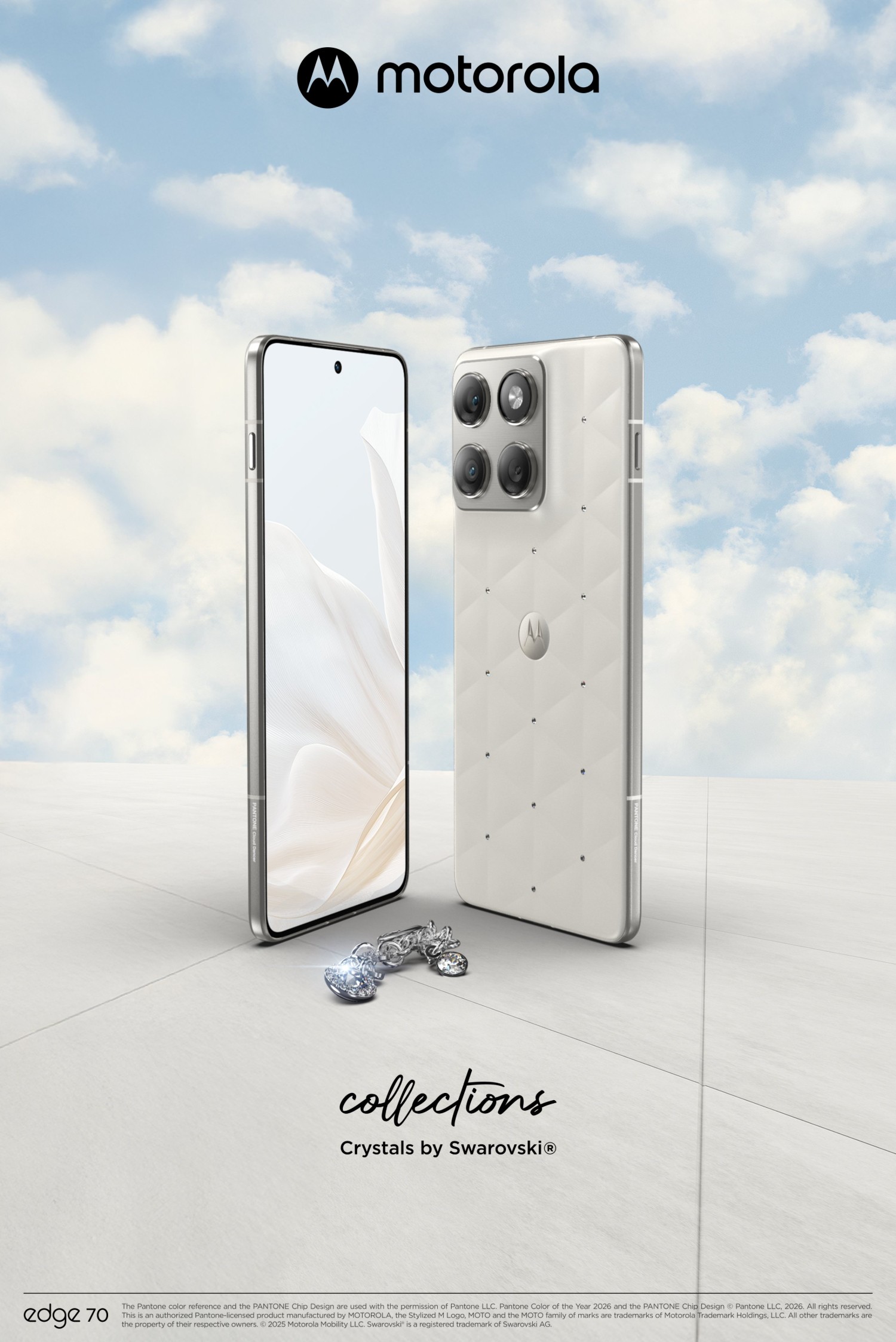 A mellékelt képen látható Motorola Edge 70 Swarovski Edition hátlapja törtfehér színű, 14 kristállyal domborított. A telefon bal oldalára ezüst keretet is kapott a "PANTONE Cloud Dancer" felirat.
